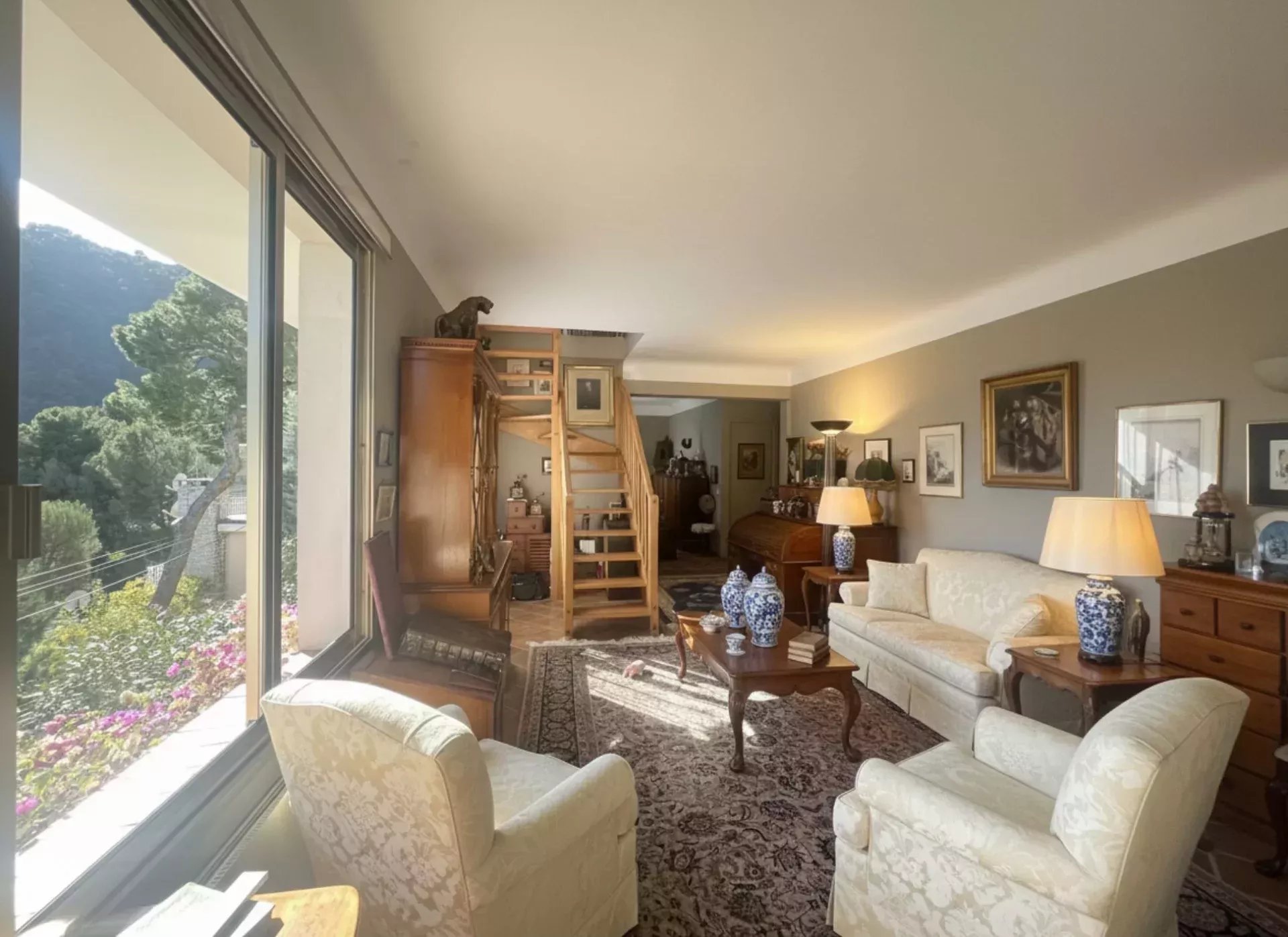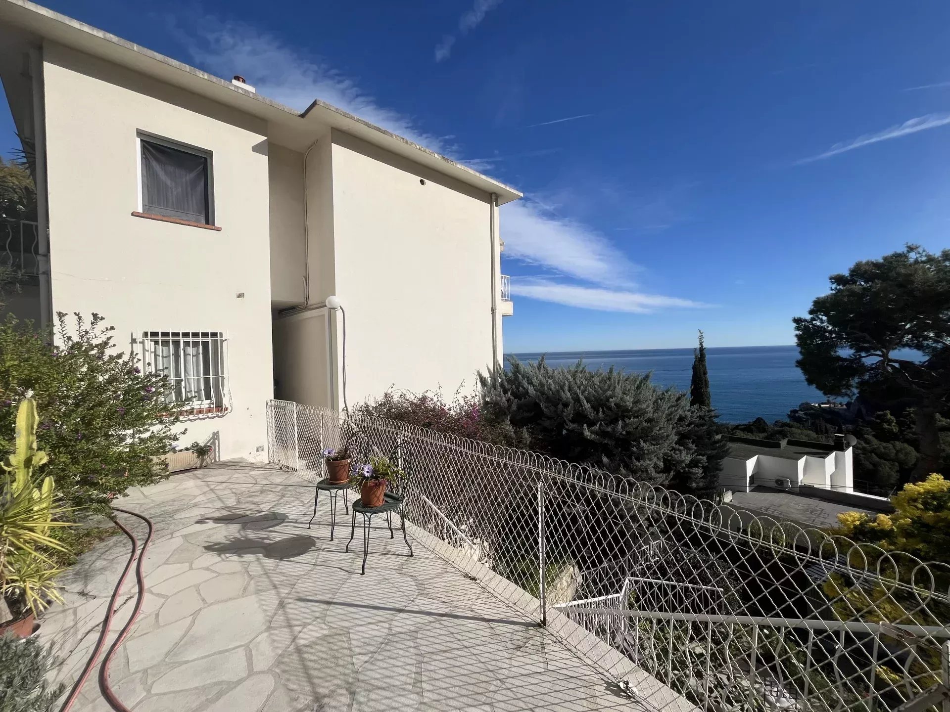 Exclusivité. Eze bord de Mer, dans un environnement privilégié, à moins de 10 minutes à pied de la plage, cet appartement de 135m² Loi Carrez, occupe le rez de jardin et le premier étage d'une maison composée de 2 lots d'habitation. Il offre une superbe vue sur la Méditerranée et d'agréables espaces extérieurs, terrasses et jardinet à usage privatif, idéal pour profiter du climat de la Côte d'Azur.