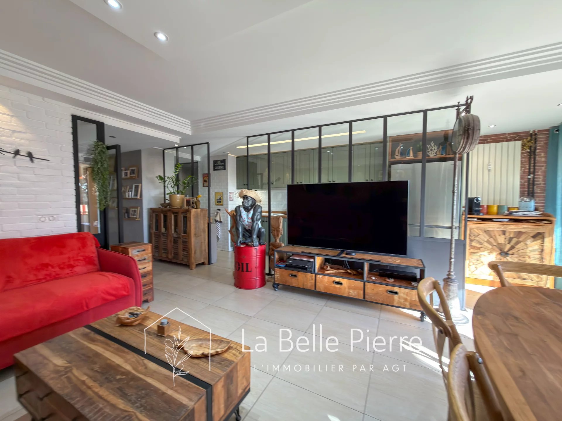 Une cuisine séparée par une verrière avec buanderie attenante.