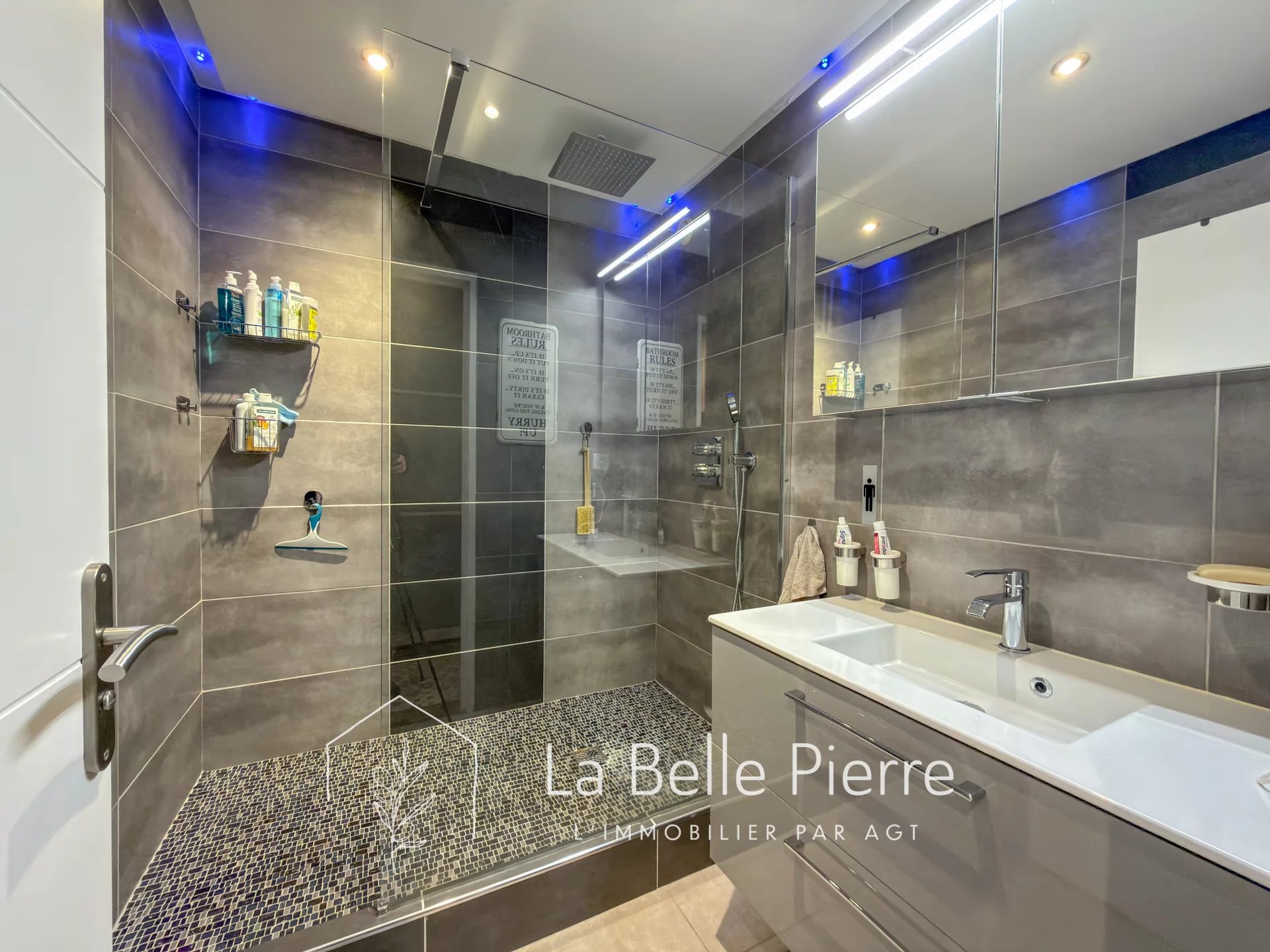 Côté nuit, vous trouverez des placards aménagés, un WC indépendant, une salle d’eau avec douche à l’italienne et deux chambres, chacune bénéficiant de sa propre terrasse.