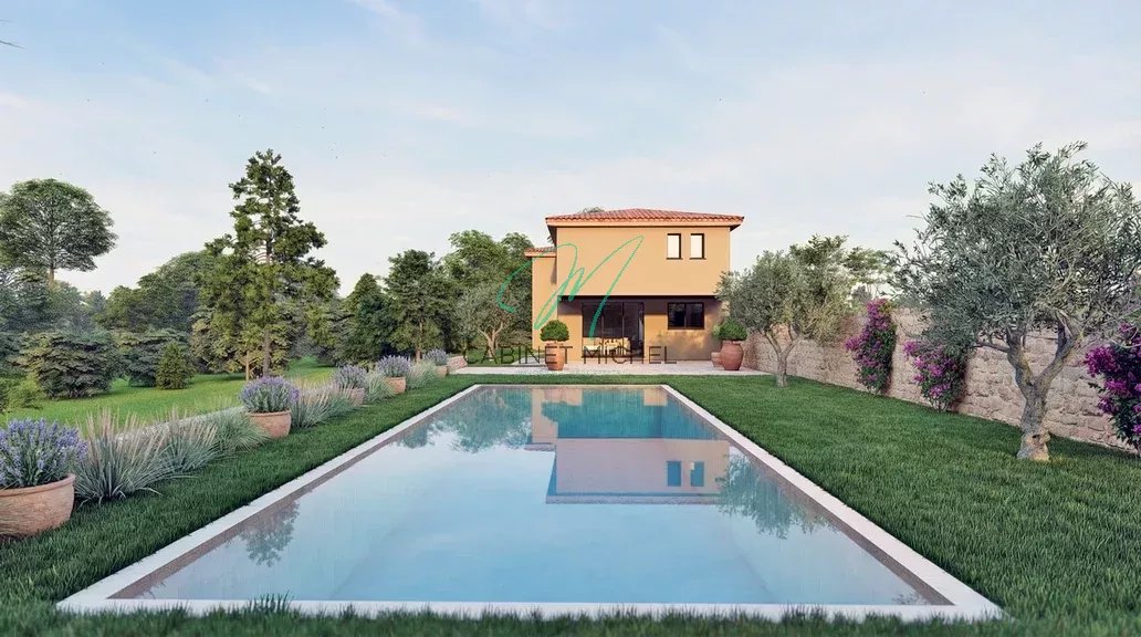 Vendu avec un permis de construire accordé et purgé pour une villa individuelle de 200 m² habitables, complétée par une terrasse de 50 m², un garage de 40 m² et une piscine de 12,5 × 4,5 m.