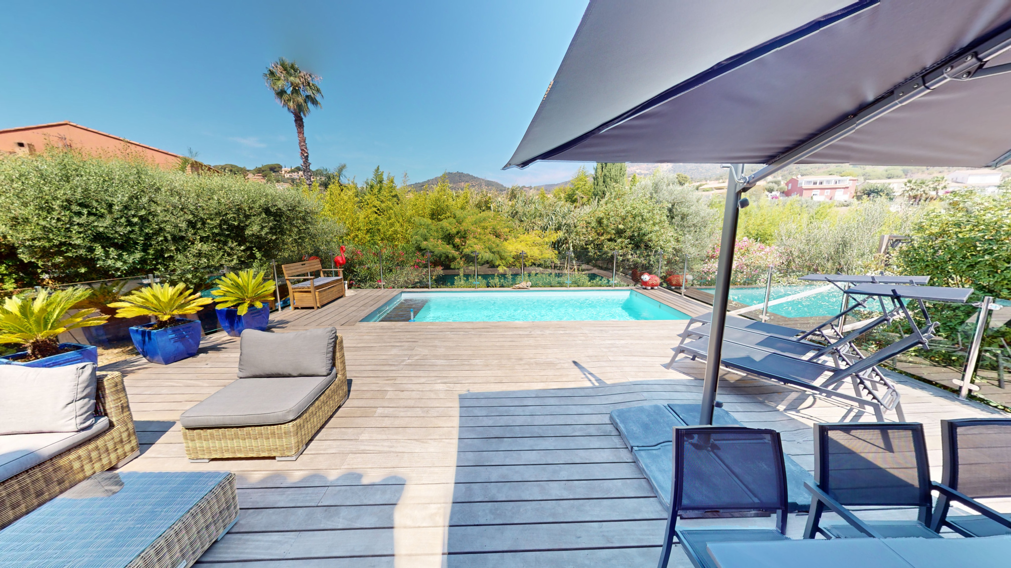 À l'extérieur, une spacieuse terrasse aménagée prolonge l'espace de vie et mène à une piscine idéale pour profiter des journées ensoleillées.