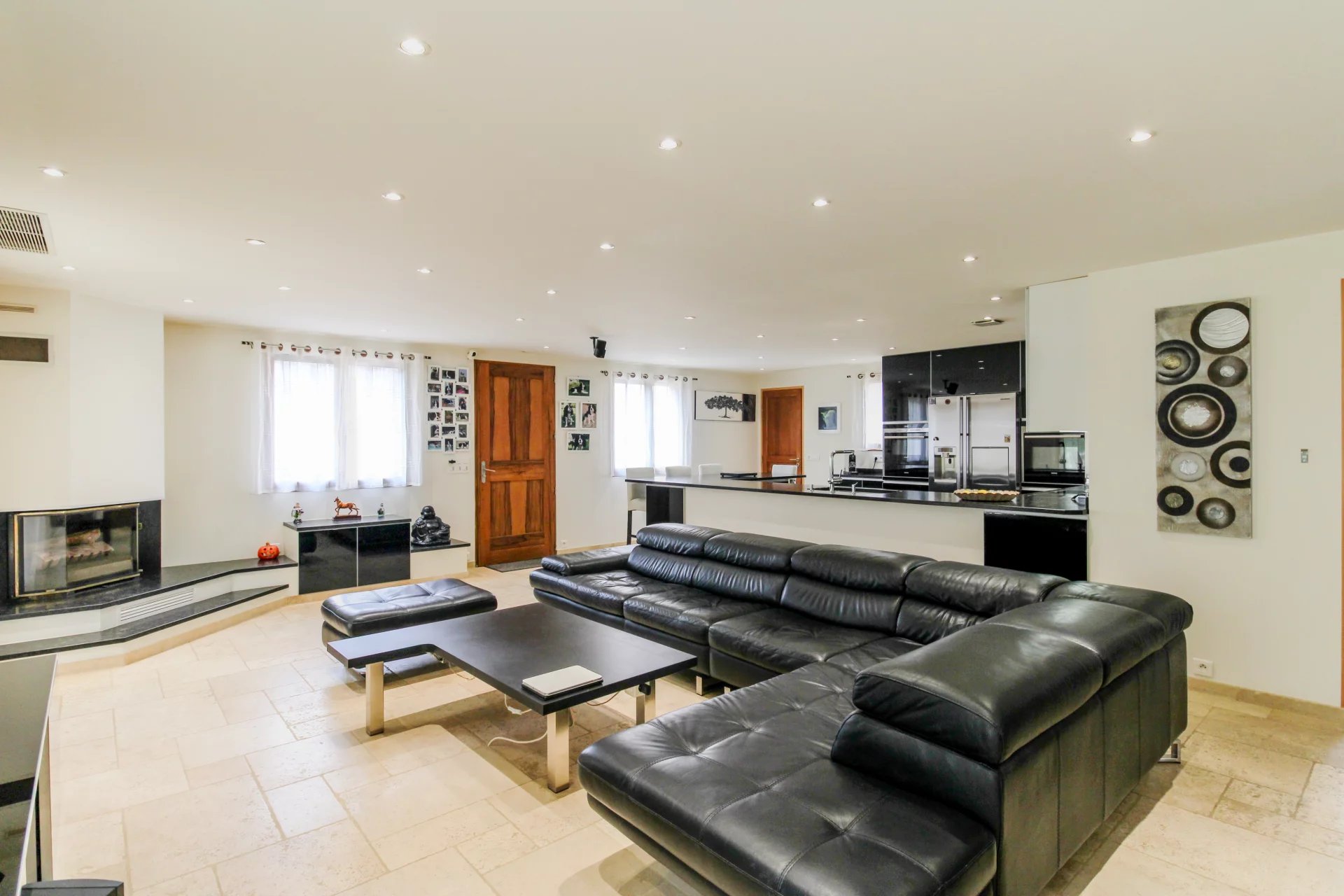 La maison se compose d’une spacieuse et lumineuse pièce de vie, avec une superbe cuisine moderne aménagée et entièrement équipée, ouverte sur le séjour.