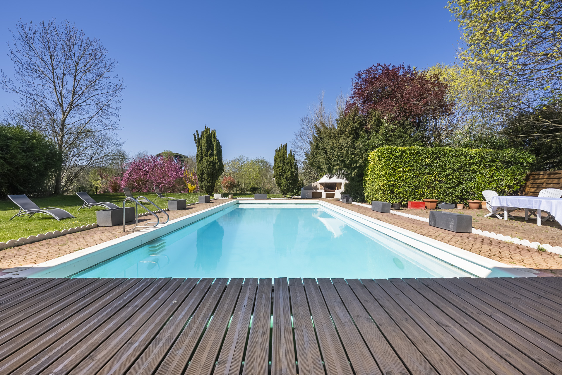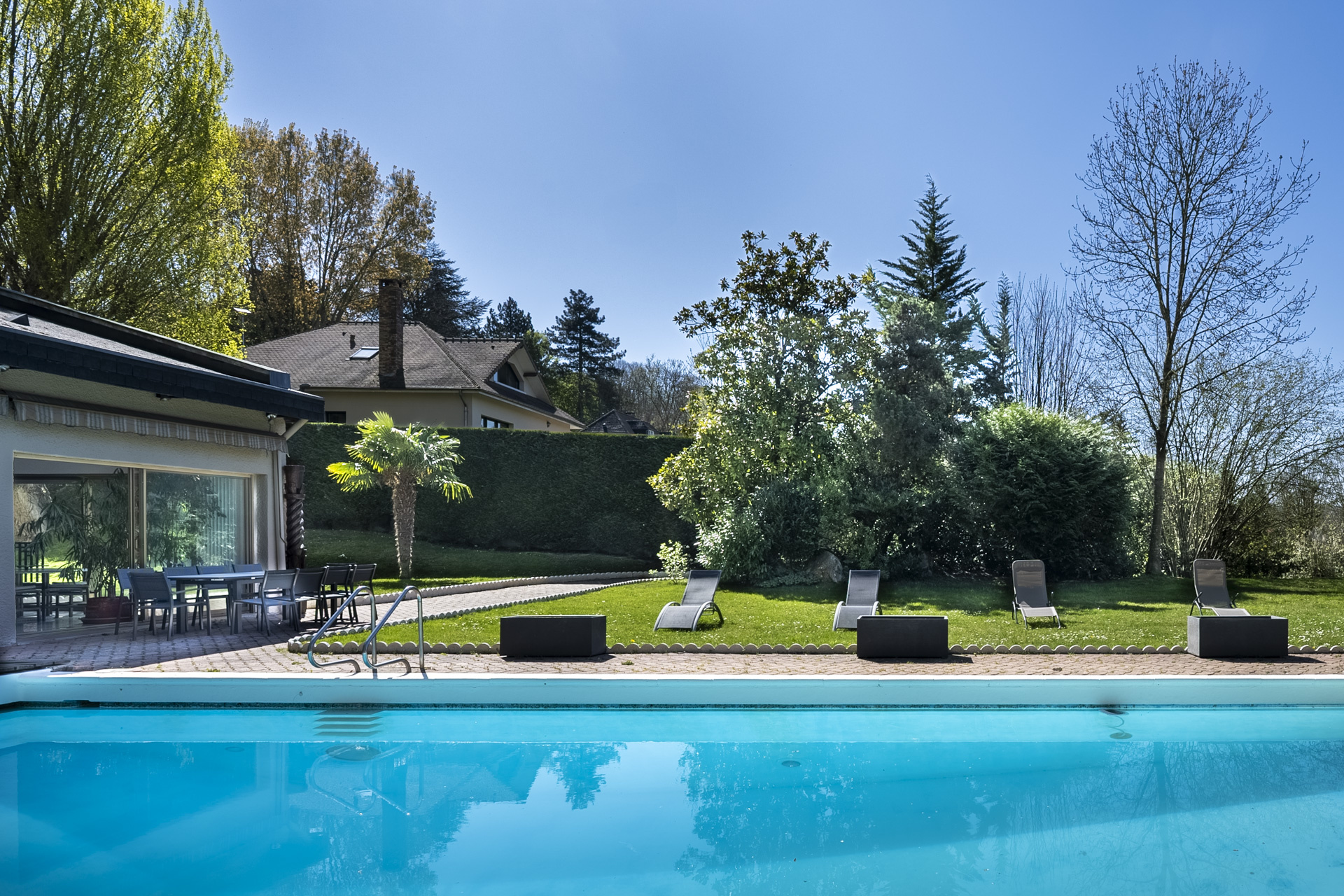 The vast 105 m2 living room, flooded with light thanks to its large openings, leads directly to the landscaped garden and the 6x14 meter outdoor swimming pool. The house includes eight spacious bedrooms, several bathrooms, and numerous living spaces, including a games room, a gym, a sauna, a cinema room, and a dance studio. An independent studio in the basement completes the ensemble. The garage, with its exceptional surface area, can accommodate at least seven vehicles. Some refreshing of the house will be necessary to bring it up to date and exploit its full potential.