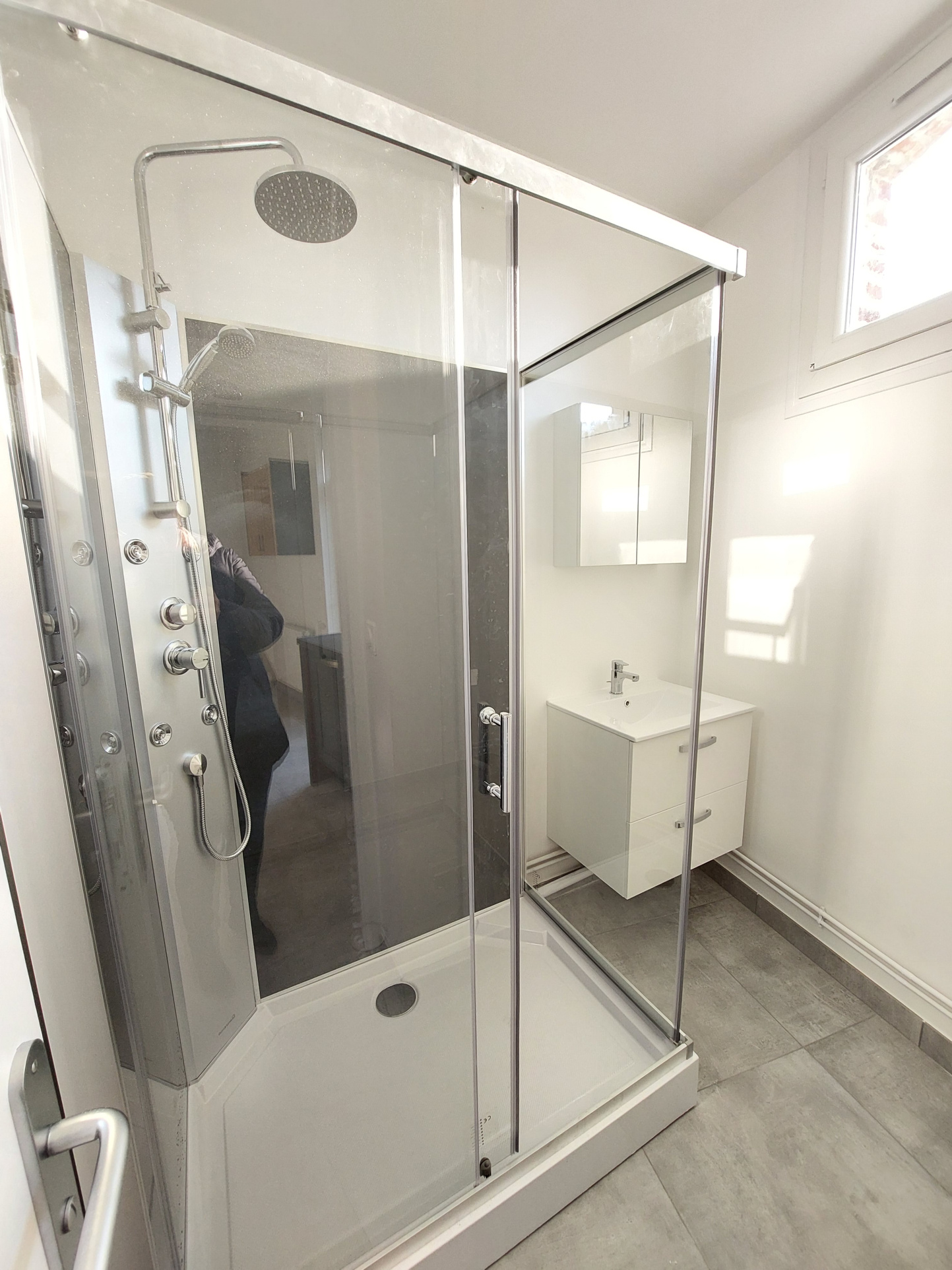 - au rdc : hall d'entrée, grand salon/séjour ourvert sur cuisine équipée, WC, salle de bain avec douche