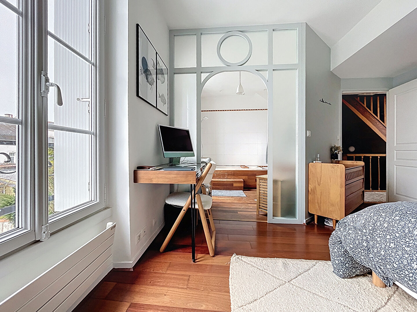 La Rochelle, proche du mail et au coeur de La Genette, belle maison de caractère des années 1900 avec une belle façade et en excellent état. Elle se compose au RDC d'une agréable pièce à vivre traversante, une cuisine ouverte aménagée et équipée et un WC, au 1er, un palier avec deux chambres dont une avec dressing et salle de bains, un WC, au 2ème une grande chambre avec salle d'eau privative. Terrasse d'environ 55 m², jardin exposé sud sur une parcelle de 121m².