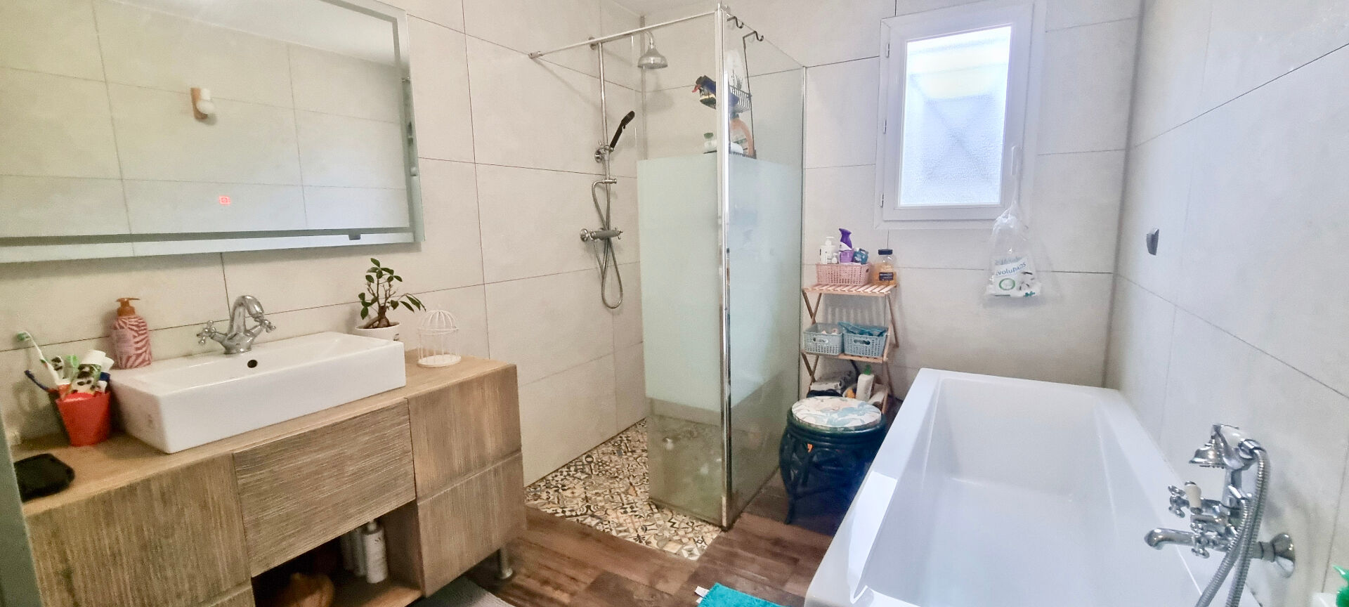 - Pièce à vivre traversante, cuisine aménagée et équipée, 4 chambres, bibliothèque, salle de bains avec douche et baignoire