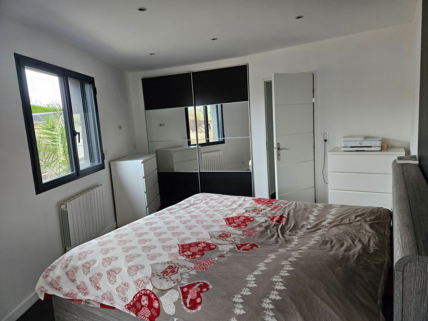 Édifiée de plain-pied, elle propose une agréable pièce de vie lumineuse avec cuisine aménagée et équipée. L'espace nuit se compose de deux chambres avec dressing, d'une salle d'eau et de WC séparés.