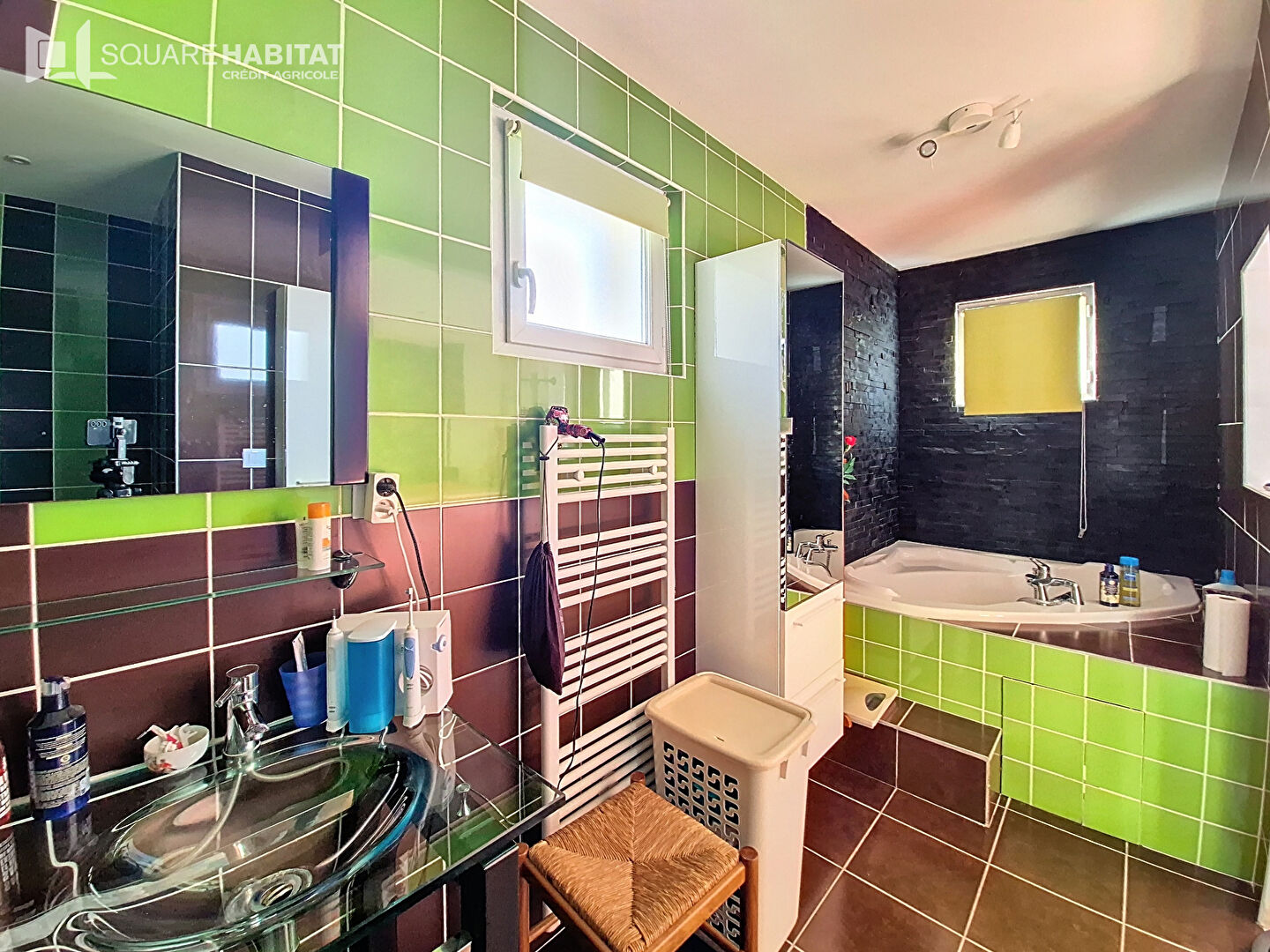 La maison propose une véritable vie de plain-pied avec une suite parentale comprenant chambre, dressing et salle de bains avec douche et baignoire. Des toilettes suspendues avec lave-mains indépendants complètent ce niveau.
