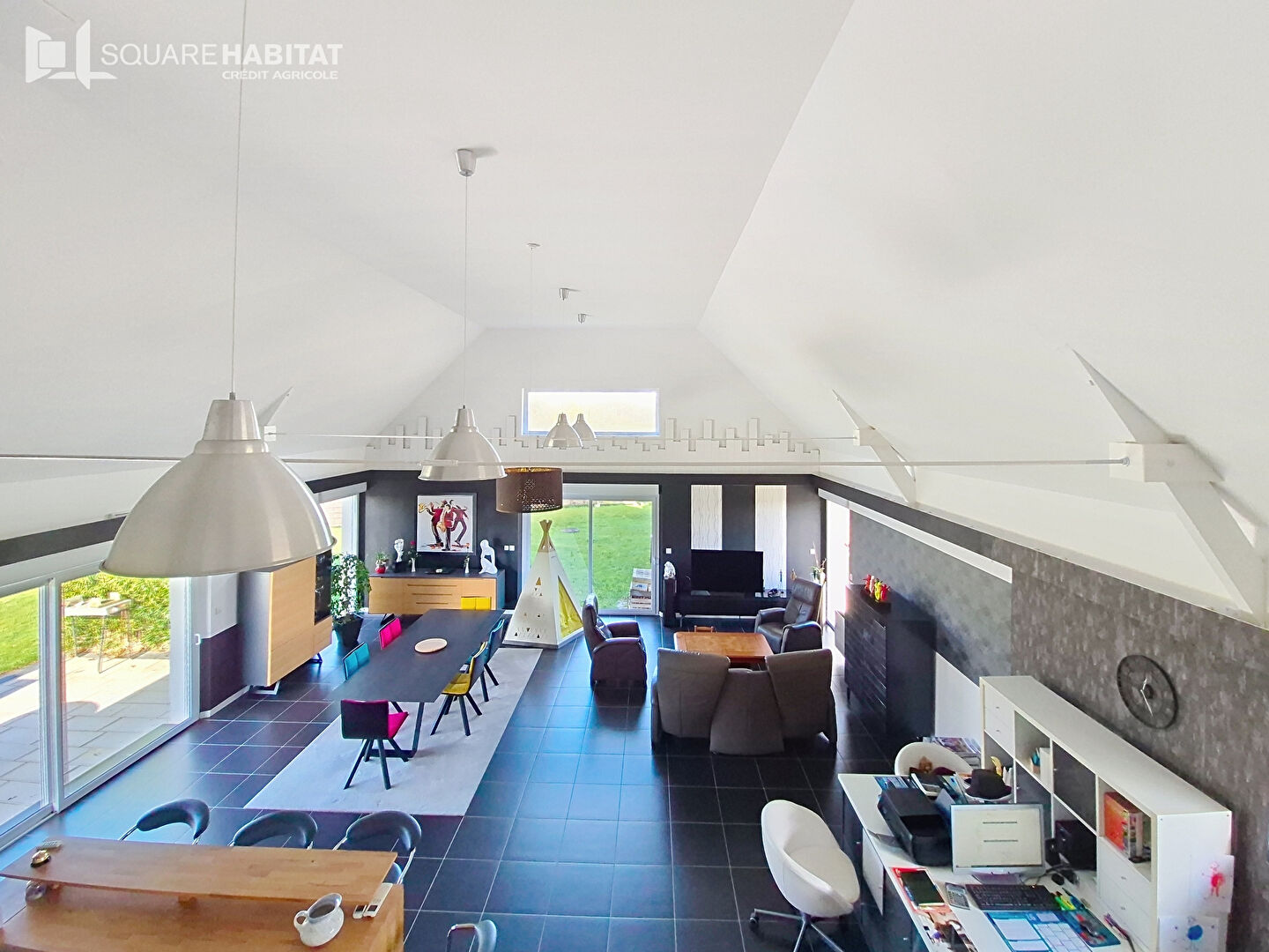 Elle se compose au RDC: d'une cuisine aménagée et équipée ouvrant sur un vaste salon-séjour. Vous serez conquis par cette belle pièce de vie baignée de lumière grâce à sa triple exposition et son toit cathédrale, offrant volume et caractère.
