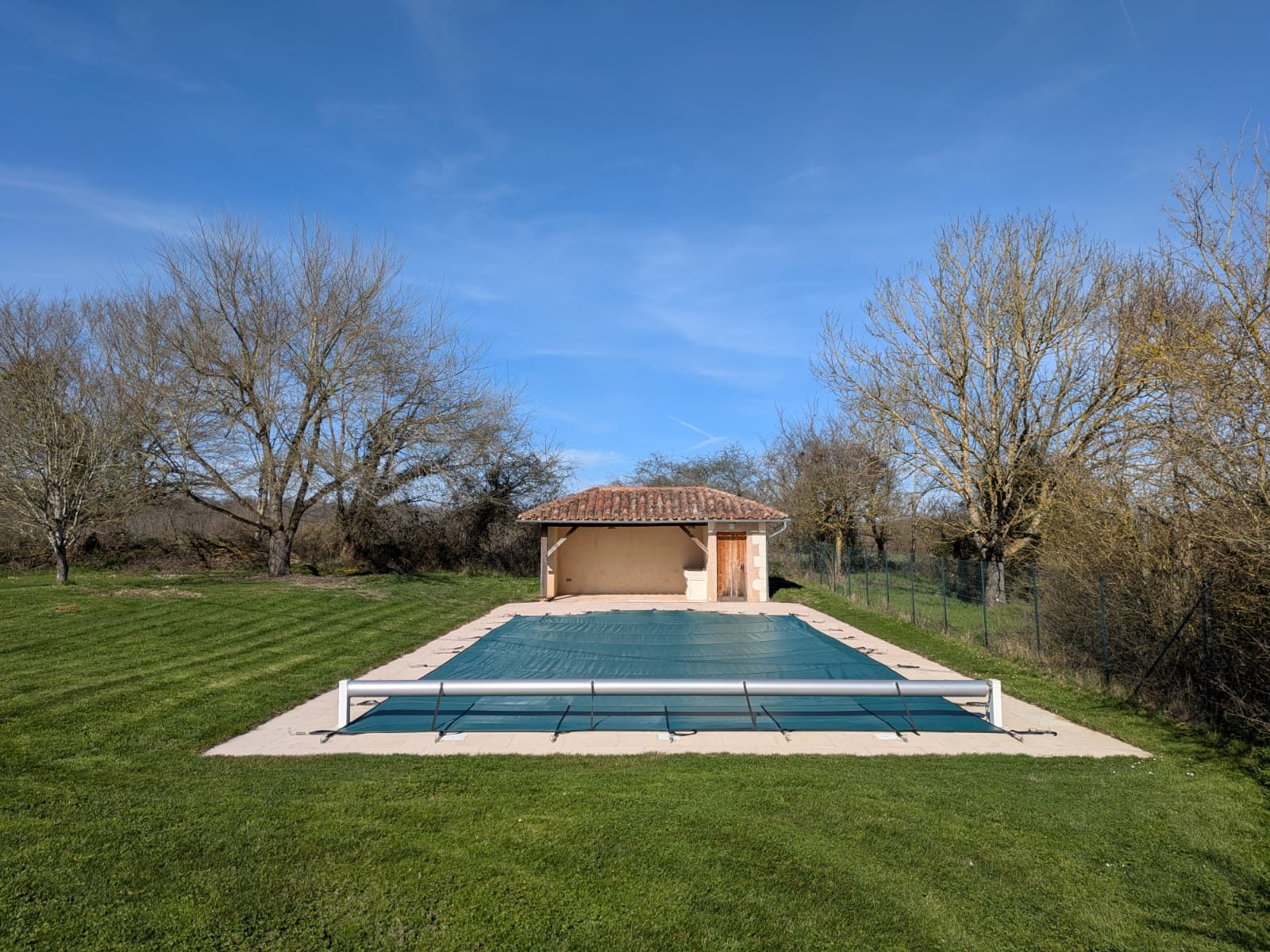 La piscine, discrètement située, est équipée d'une couverture à enrouleur et s'accompagne d'une agréable terrasse ombragée, parfaite pour se relaxer durant les chaudes journées d'été.