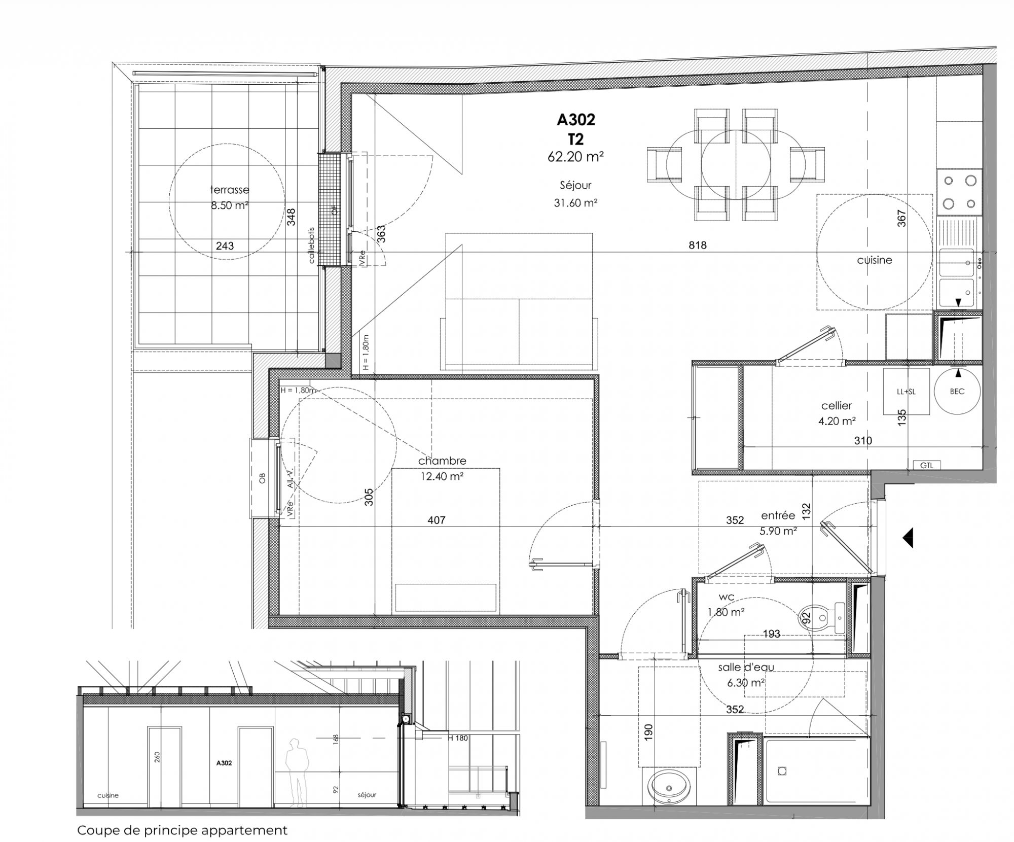 - Séjour 31,6m2 donnant sur terrasse 8,5m2 (profondeur 2,43m)