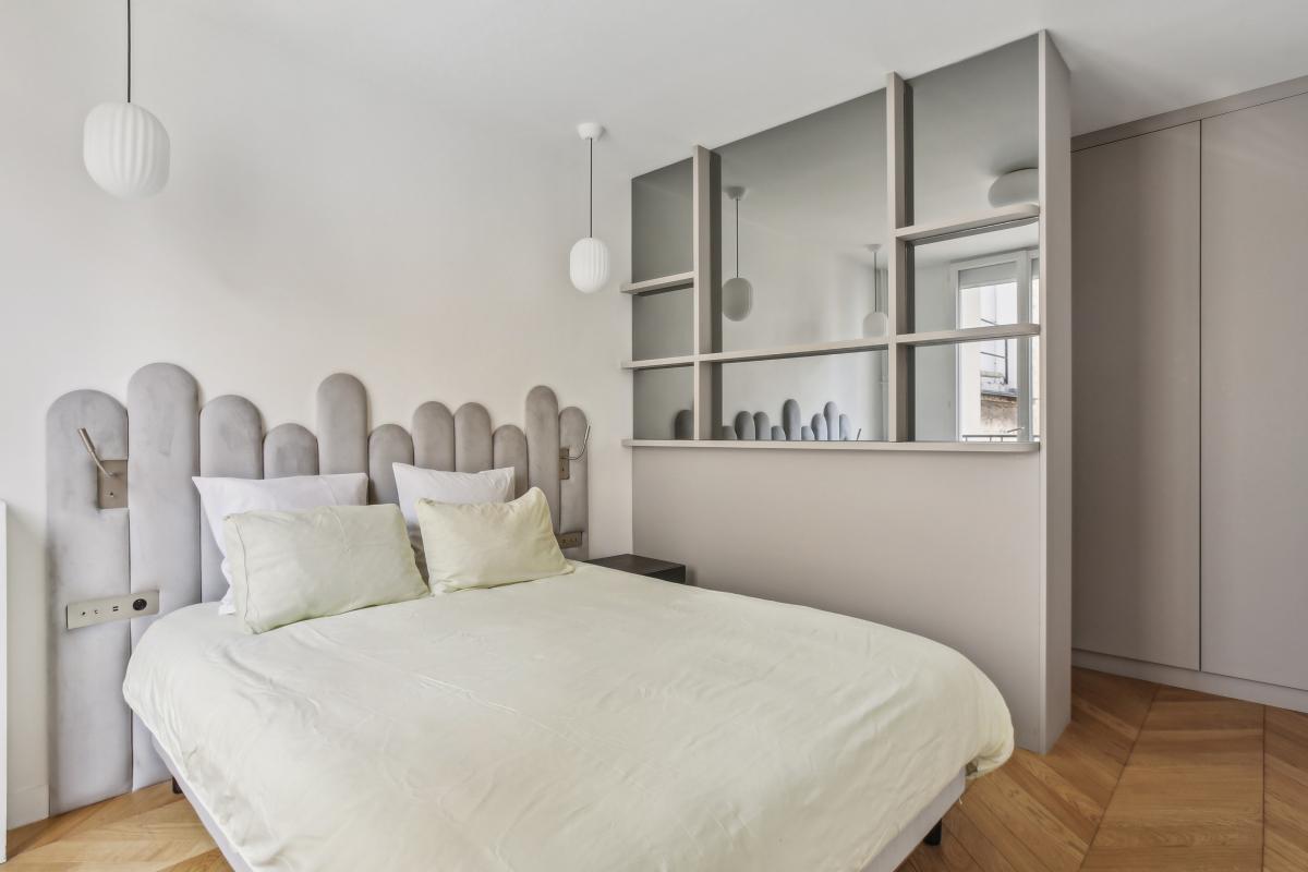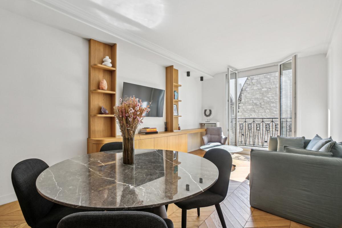Très lumineux grâce à son exposition sud-ouest, sans vis-à-vis et au calme absolu, il offre un véritable havre de paix en plein coeur de Paris. Le charme de l'ancien est sublimé par un parquet en pointe de Hongrie, de belles moulures et une hauteur sous plafond de 2,80 m, harmonieusement associés à des matériaux de qualité et un éclairage contemporain.