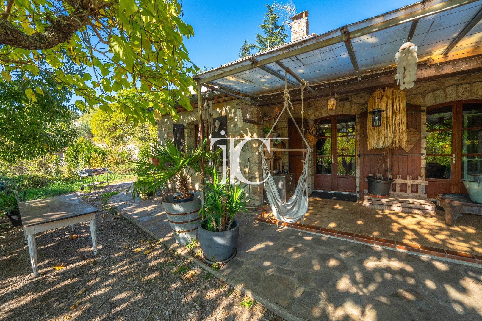 Maison en pierre de 145 m² habitables située sur les hauteurs des Vans, en position dominante et exposée plein sud, dans un environnement calme et sans vis-à-vis, à proximité des commodités.