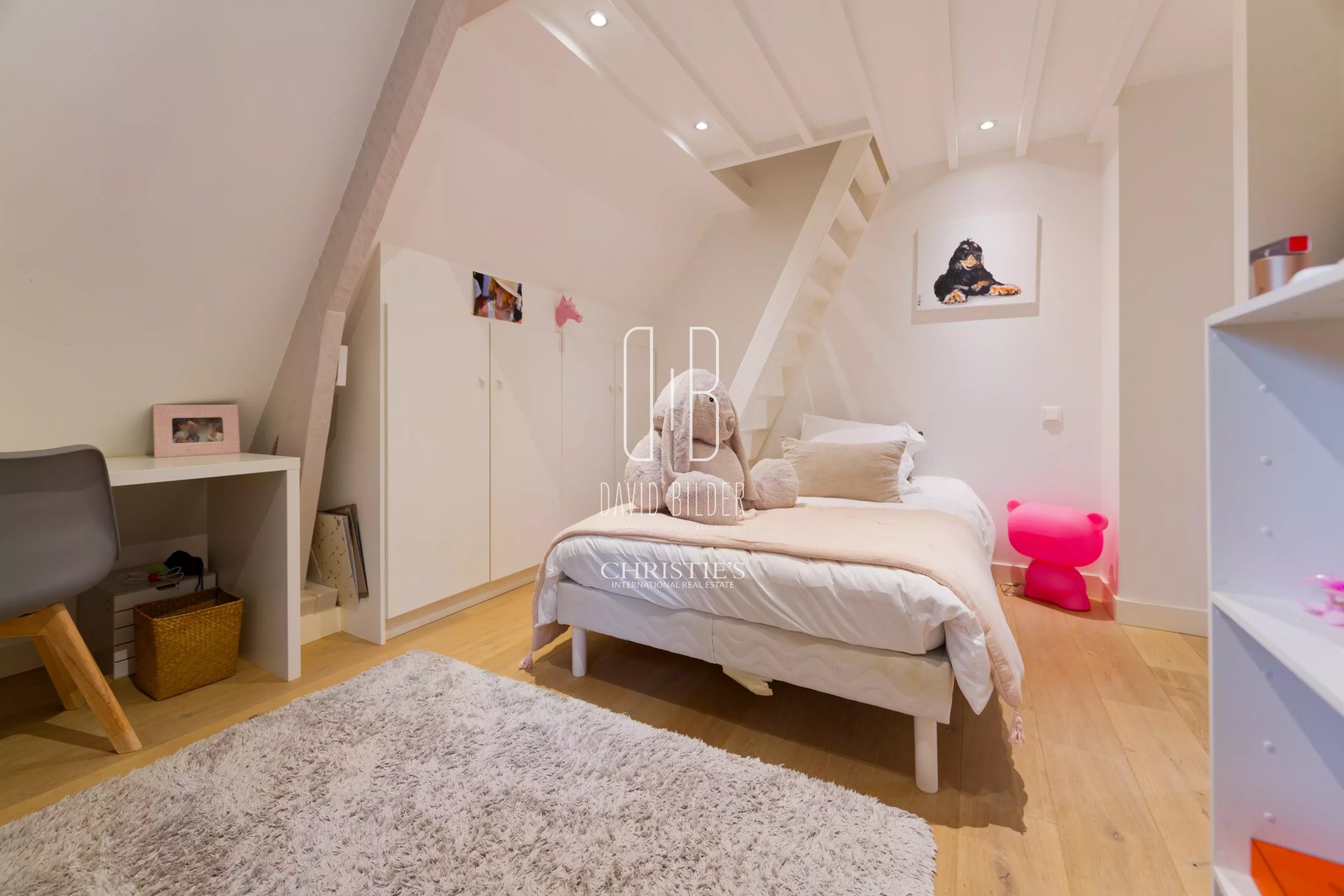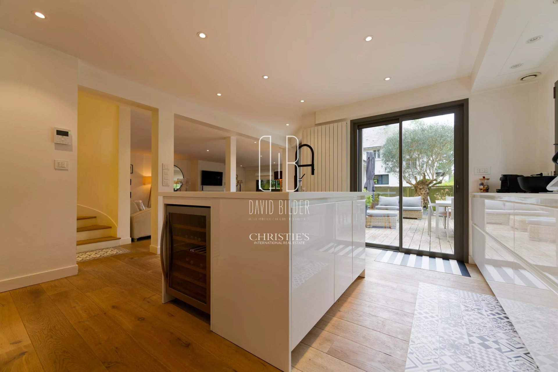 À l'intérieur, Sur un espace de vie de 80m2, parquet, cheminée, escalier sculptural, cuisine sur-mesure haut de gamme et finitions soignées dans chaque pièce témoignent d'une rénovation menée sans compromis.