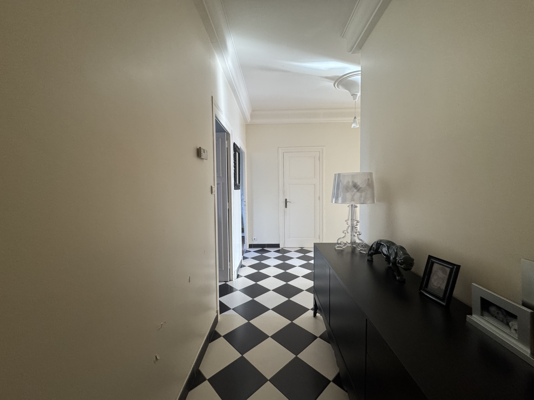 Le couloir, hall d'entrée et cuisine quant à eux sont ornés d'un chic carrelage en damier.