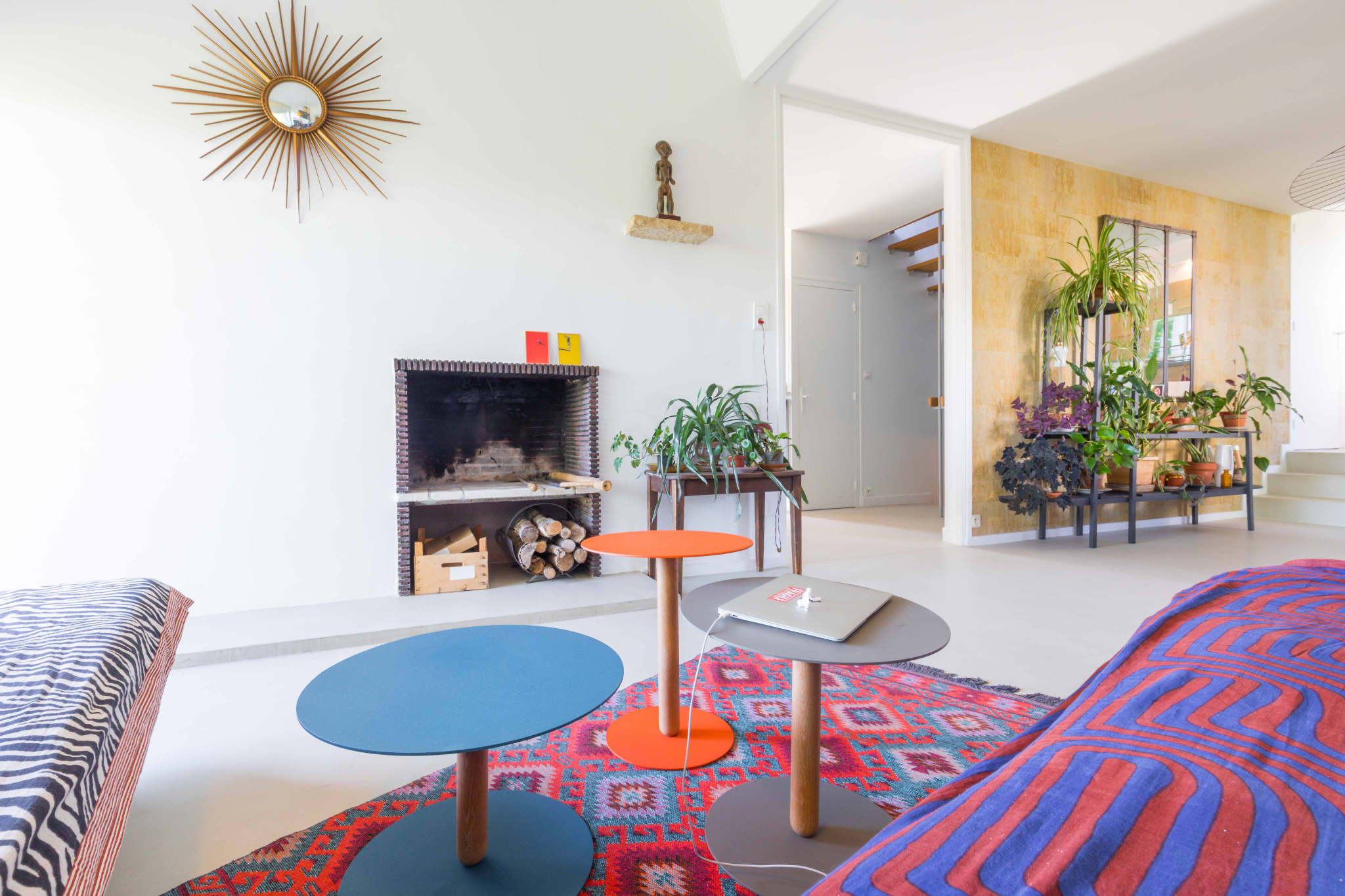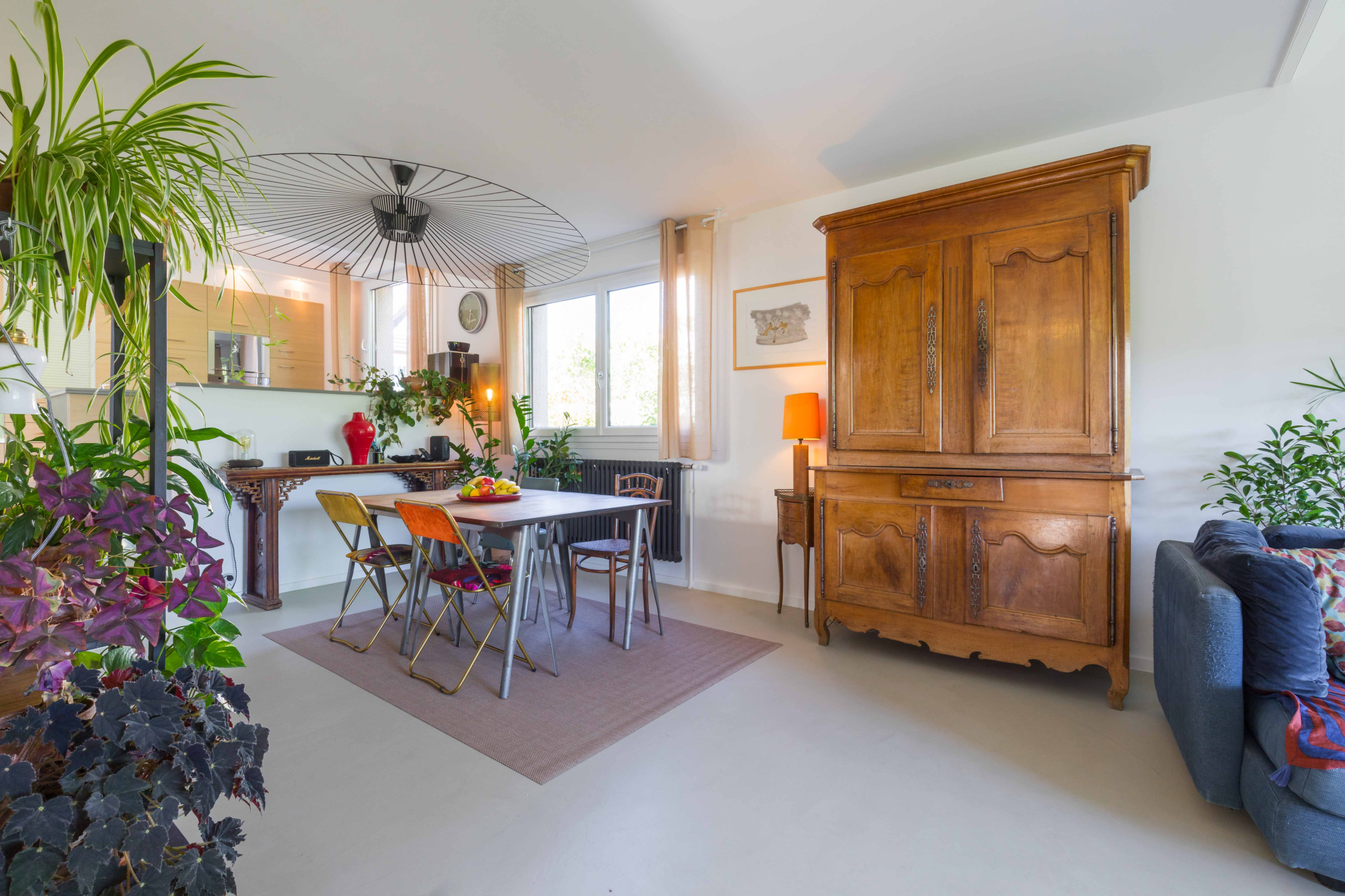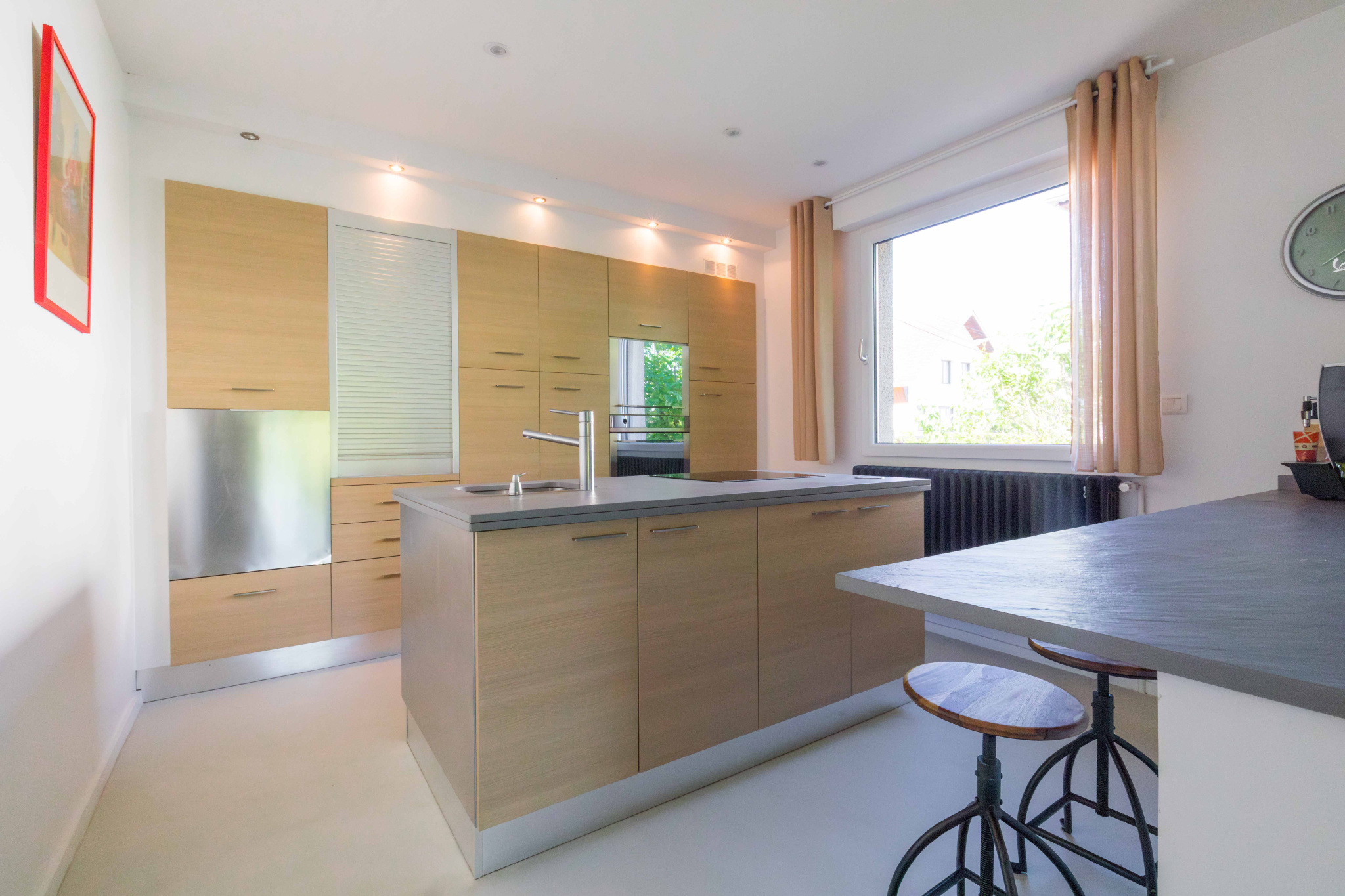 Hall d'entrée, cuisine aménagée et équipée ouverte sur séjour (42 m2) avec cheminée et accès balcon exposé Sud.