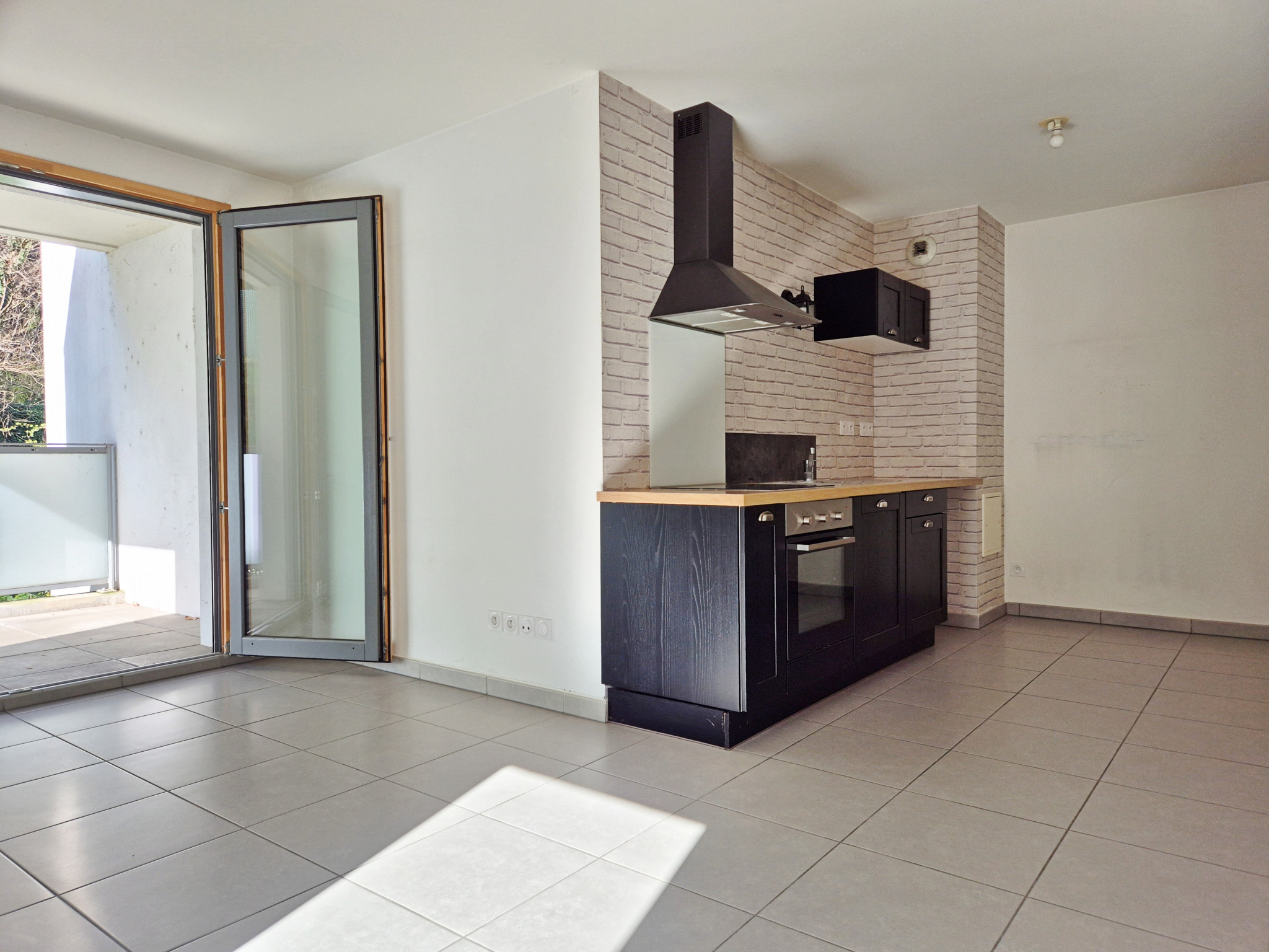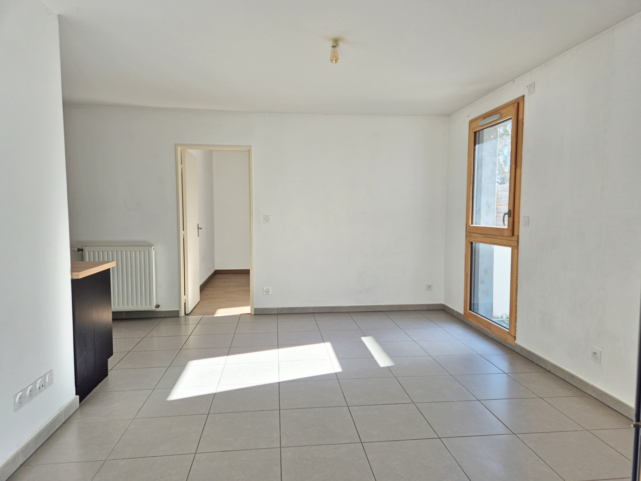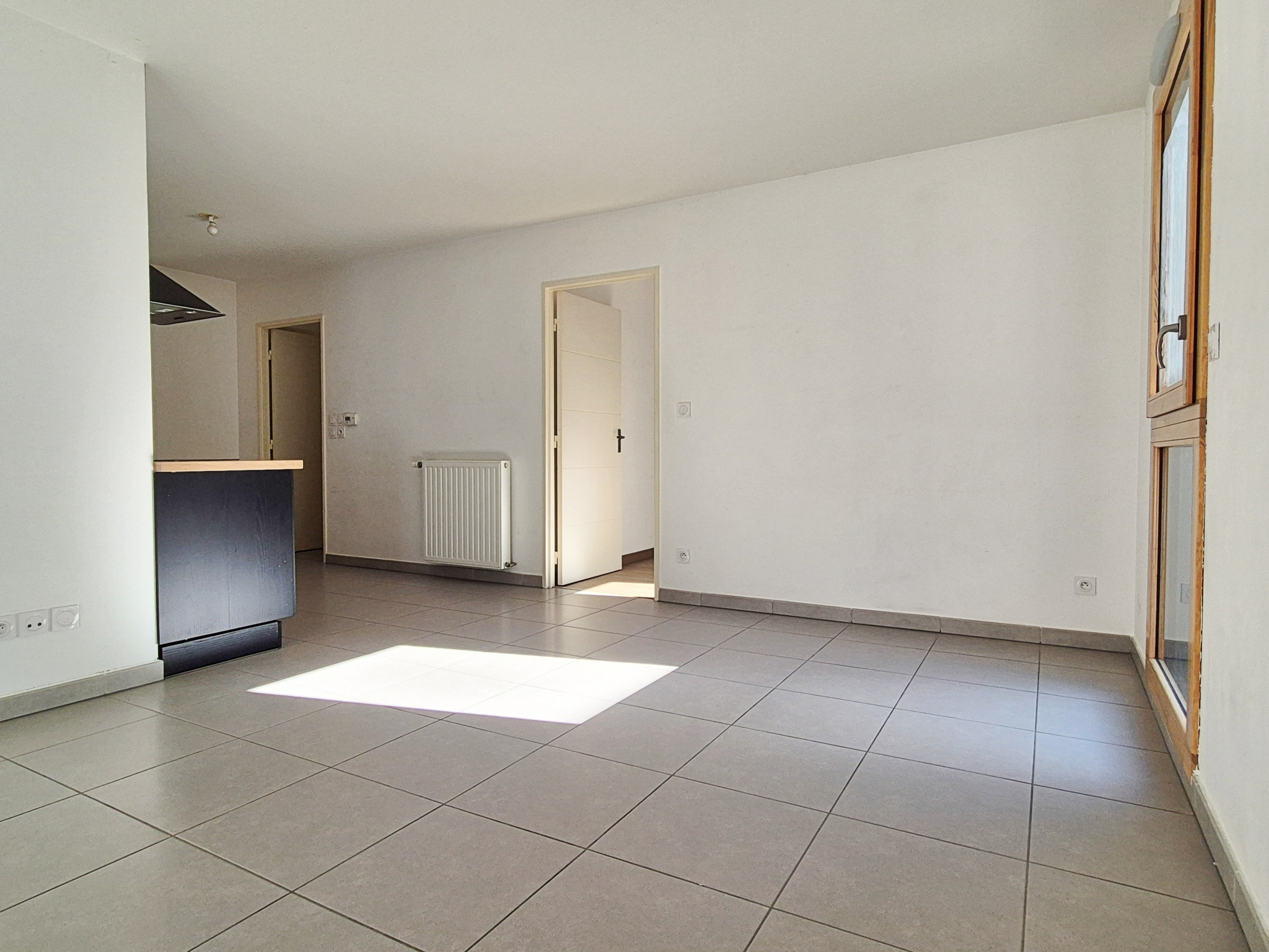 L'entrée avec placard ouvre sur une jolie pièce à vivre de 24 m2 avec cuisine ouverte équipée et accès au balcon de 5,5 m2, une chambre de 12 m2 et une salle d'eau avec WC.