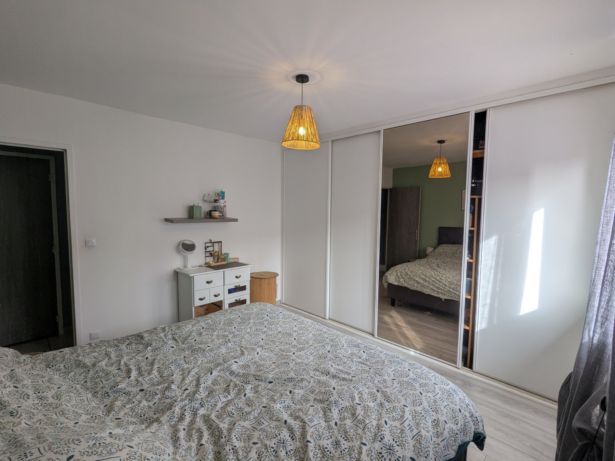 Elle offre un hall d'entrée avec dressing ouvert un salon/séjour de 42 m2 avec accès à la terrasse sur l'arrière de la maison ( ouest) , au dessus du séjour, une mezzanine avec vélux ( possibilité de fermer pour créer un espace nuit complémentaire) deux chambres dont une de 15 m2, cuisine meublée, salle d'eau et toilette séparé.