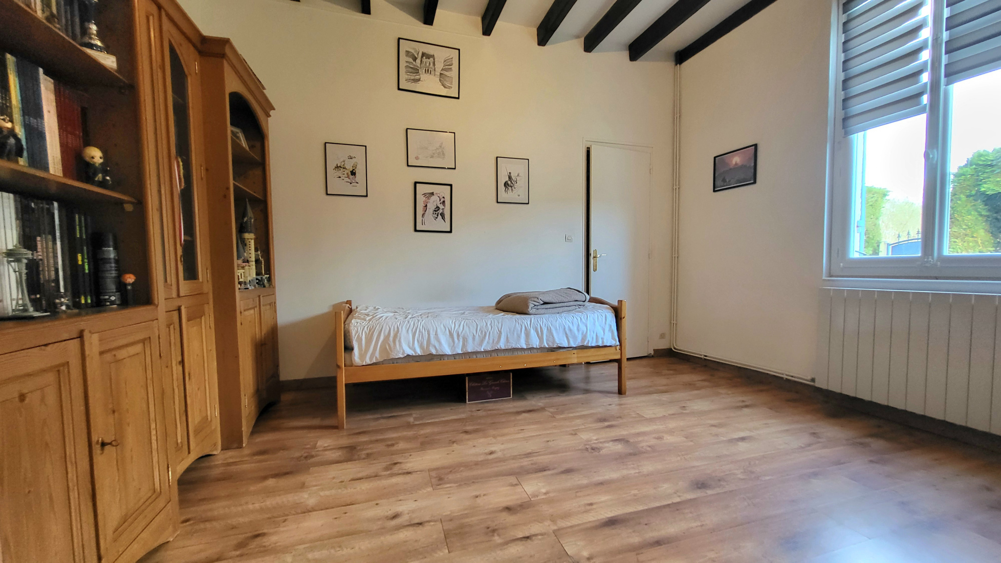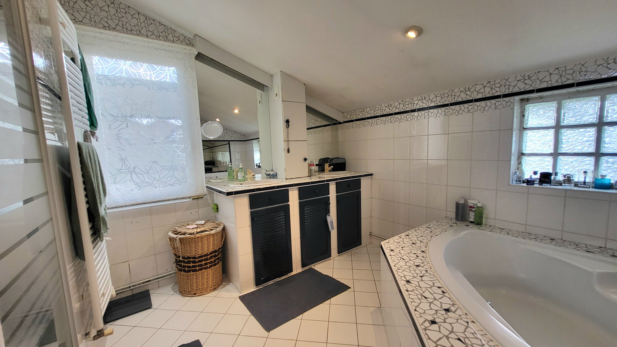 La maison propose quatre chambres et un bureau, une configuration idéale pour une grande famille ou pour ceux qui souhaitent disposer d'un espace de télétravail. Deux chambres sont situées en rez-de-chaussée, offrant une vraie flexibilité d'usage. Une grande salle de bain équipée à la fois d'une douche et d'une baignoire.