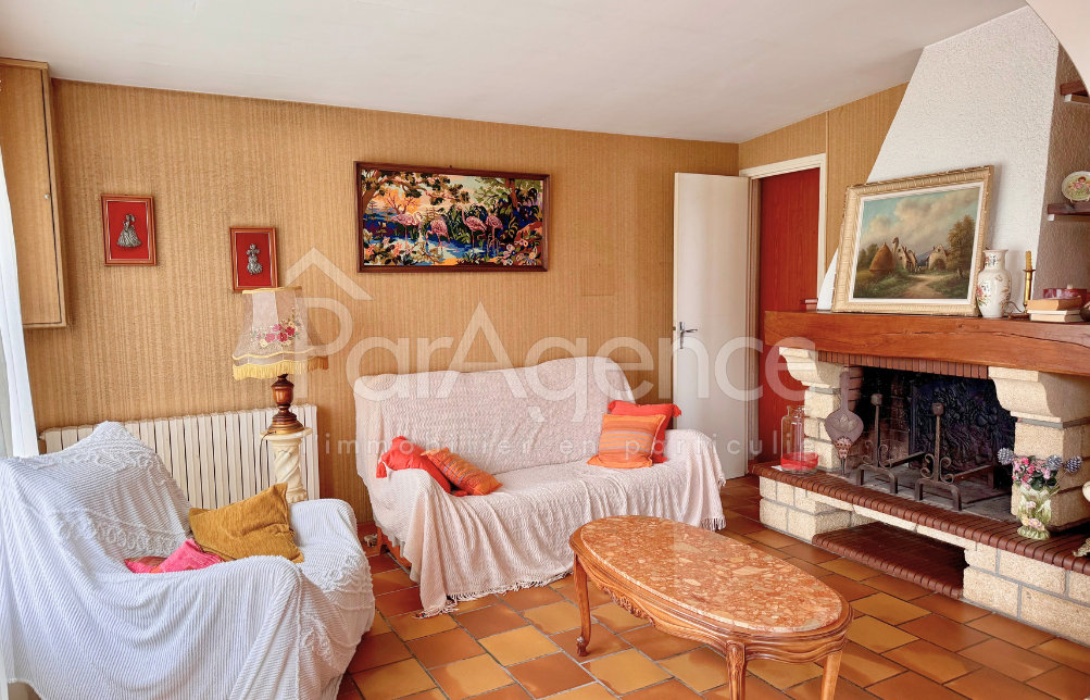 Rez-de-chaussée : L'entrée dessert un salon lumineux avec cheminée, une cuisine pratique prolongée par une arrière-cuisine, deux chambres, une salle de bains et un WC indépendant, offrant un espace de vie convivial et fonctionnel pour la vie de famille.