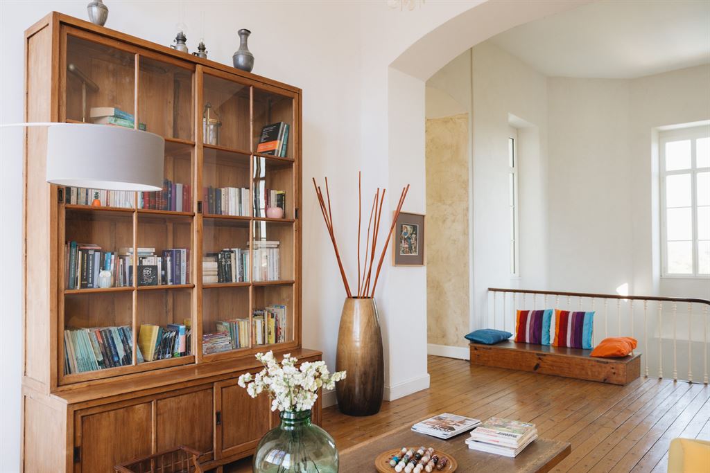 A l’étage on profite d’un salon bibliothèque baigné de la lumière de hauts vitraux très clairs.