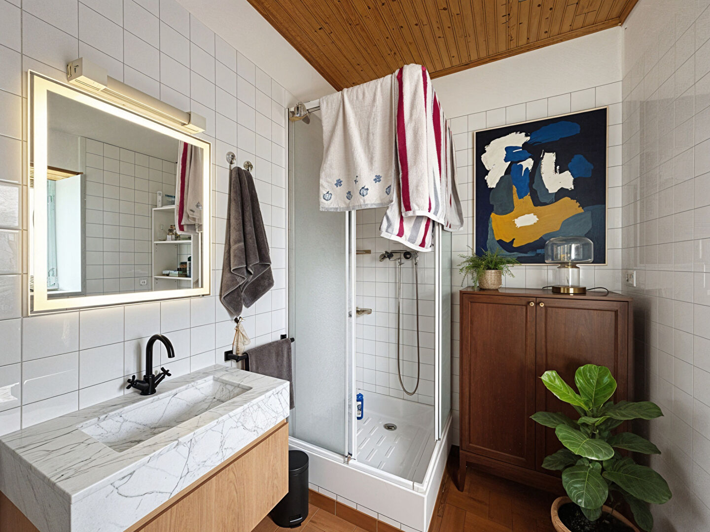 Dès l'entrée, le rez-de-chaussée propose une pièce de vie conviviale avec une cuisine ouverte qui favorise les moments de partage et de convivialité. Sur ce même niveau, un bureau vient compléter l'espace et peut facilement être utilisé comme espace de télétravail, chambre d'appoint ou pièce polyvalente selon les besoins, ainsi qu'une grande buanderie aménageable en chambre, une salle d'eau et un wc.