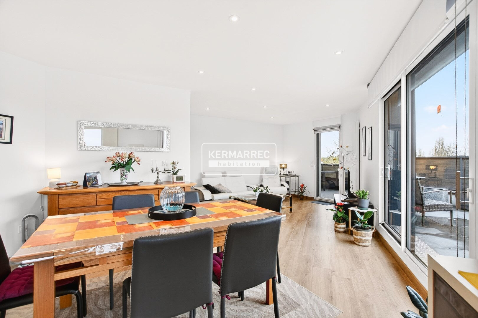 Dès l'entrée, vous serez séduit par une superbe pièce de vie d'environ 43 m², particulièrement lumineuse, comprenant un séjour et une cuisine aménagée et équipée. Cet espace s'ouvre largement sur une première terrasse d'environ 30 m², idéale pour profiter pleinement des beaux jours.