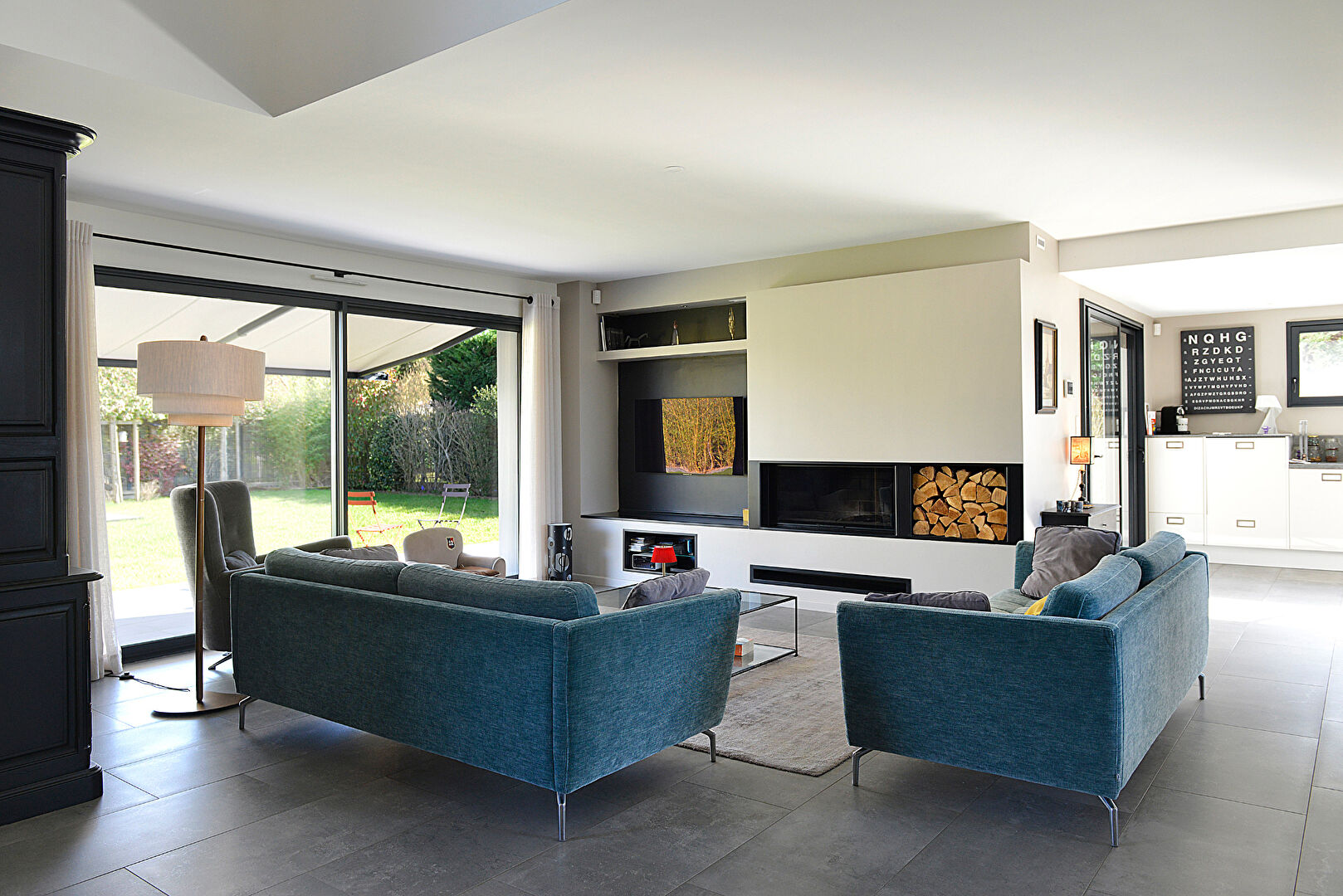 Espace de vie : un volume remarquable de 75 m² comprenant séjour, salon avec une cheminée insert 16/9 ème et cuisine toute équipée