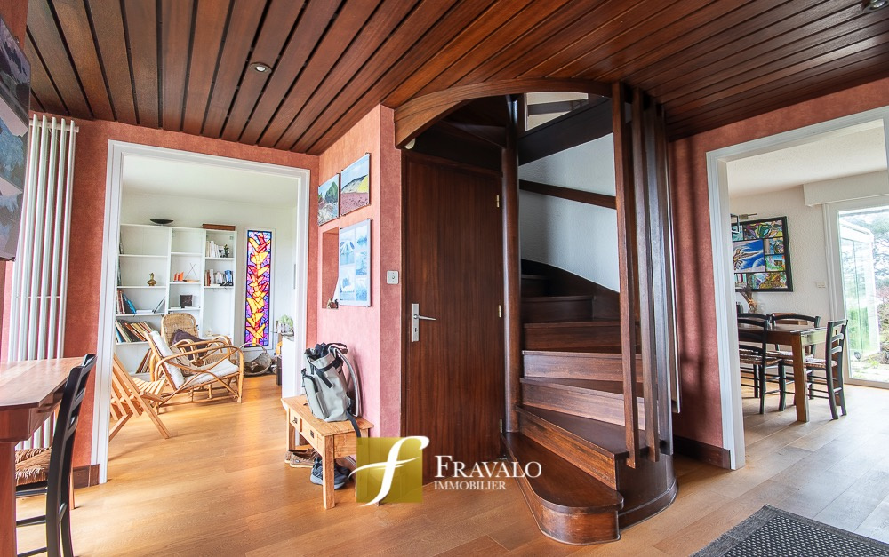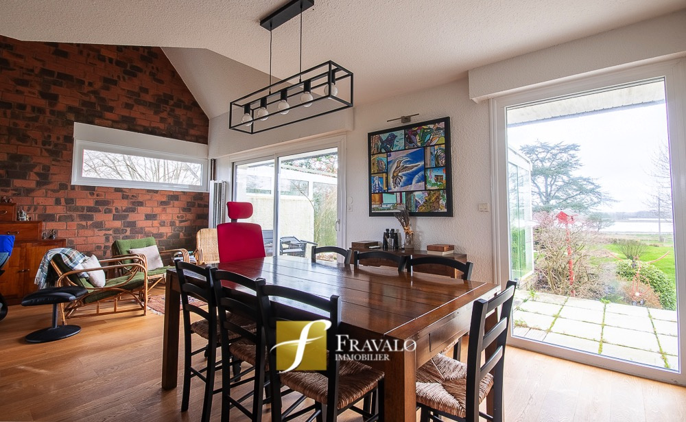 Sur la commune de Séné, au sein du quartier prisé de Montsarrac, cette maison de 130 m2 (145 m2 au sol) offre une vue magnifique sur le golfe à l'est comme à l'ouest. Elle présente au rez-de-chaussée une entrée, un vestibule, une grande pièce de vie avec cheminée, une cuisine aménagée-équipée avec un coin arrière-cuisine, une chambre avec salle d'eau et un wc séparé. A l'étage vous découvrirez une mezzanine, trois chambres, un wc et une salle de bains. La maison dispose également d'un sous-sol complet. Le jardin, joliment arboré, plonge directement sur la vue du golfe depuis la terrasse de la maison. Ce bien est implanté sur un terrain de plus de 1500 m2, il se situe à 200m d'un arrêt de bus, à 1km de la plage, à 10 min en vélo du centre de Séné et de ses commerces ainsi qu'à 10 min en voiture du port de Vannes. Estimation des coûts annuels d'énergie pour un usage standard du logement: entre 1454 EUR et 1966 EUR (abonnement compris). Les informations sur les risques auxquels ce bien est exposé sont disponibles sur le site Géorisques : georisques.gouv.fr