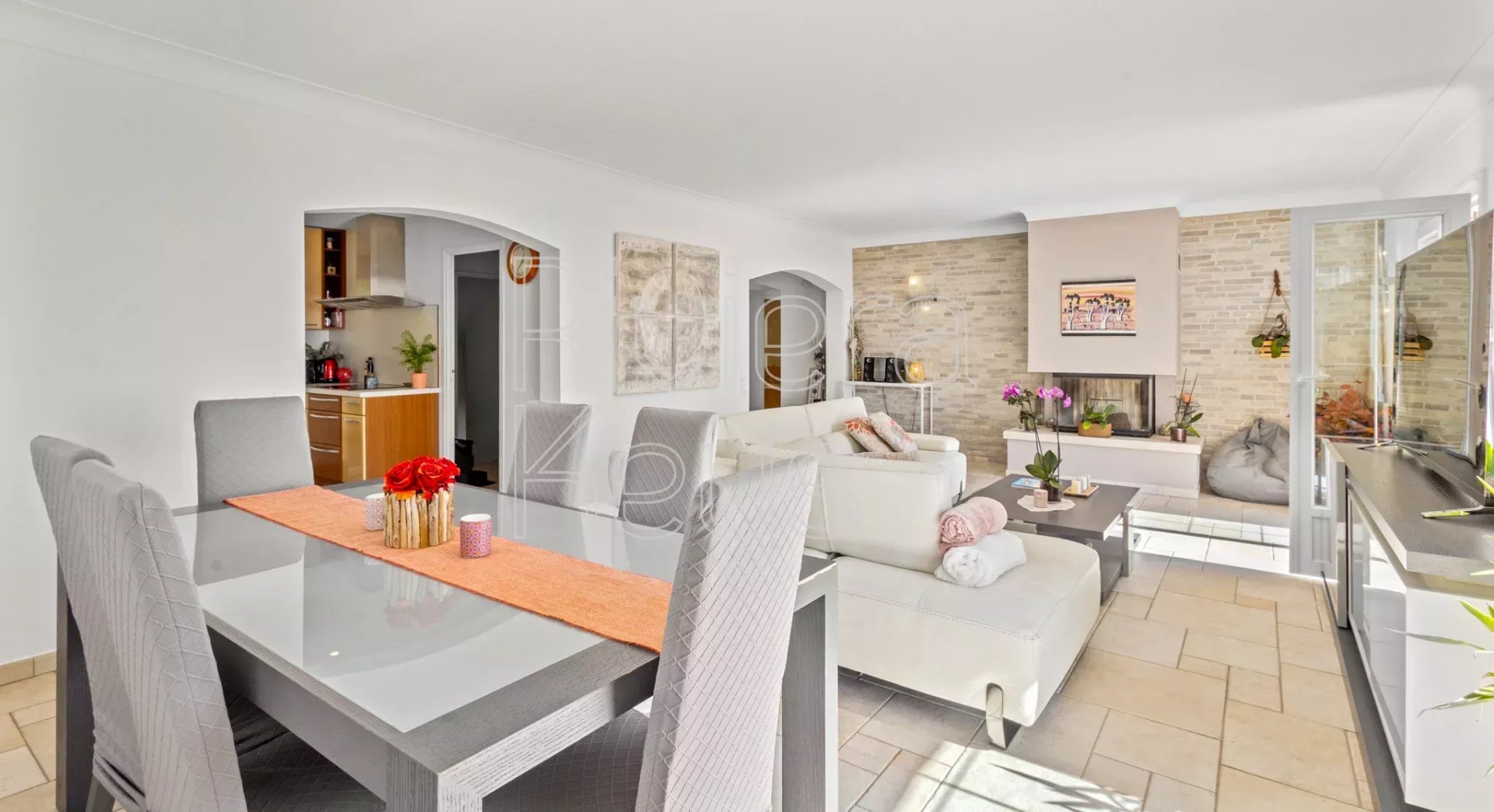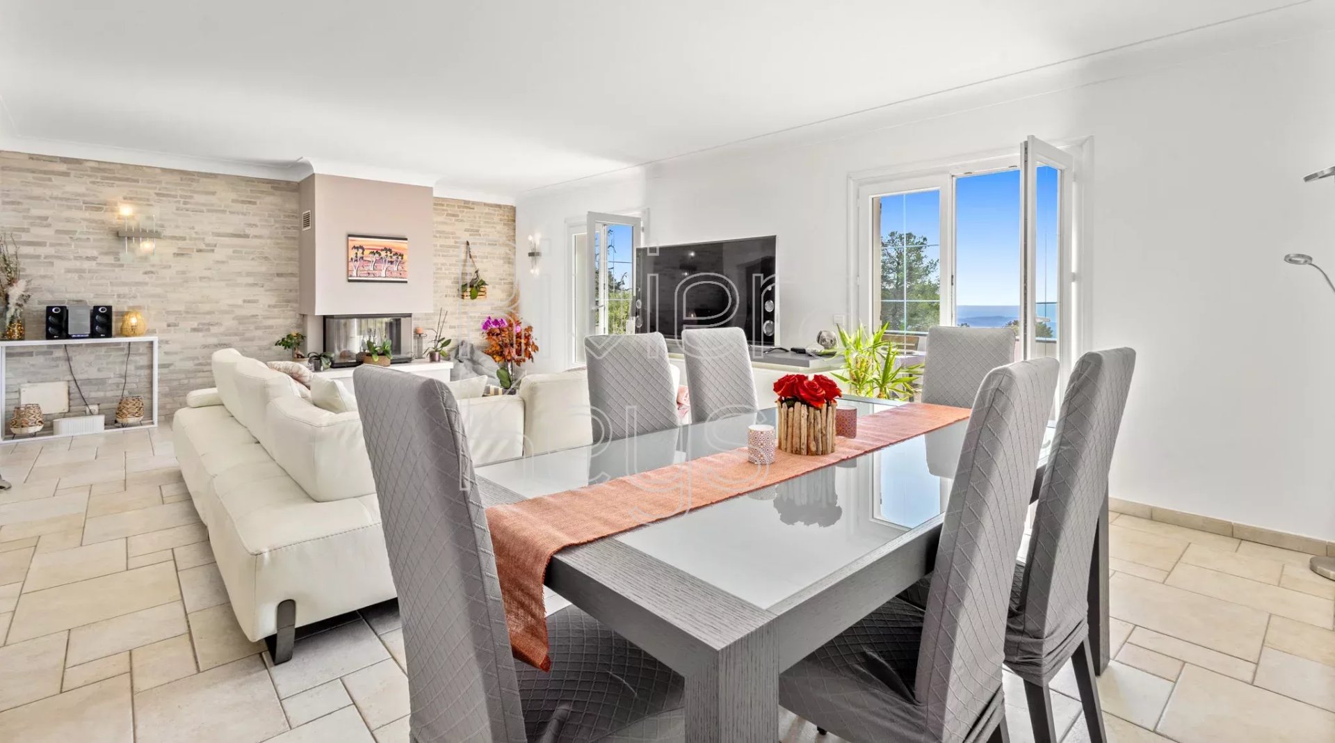 La villa, organisée sur 3 niveaux, s’ouvre sur une entrée desservant un vaste salon/salle à manger avec cheminée, prolongé par une terrasse d’environ 40 m², une cuisine ouverte avec buanderie ainsi qu’un second séjour avec cheminée, 3 grandes chambres, une salle de bains et des toilettes. Le premier étage accueille une spacieuse chambre avec salle d’eau, rangements et terrasse.