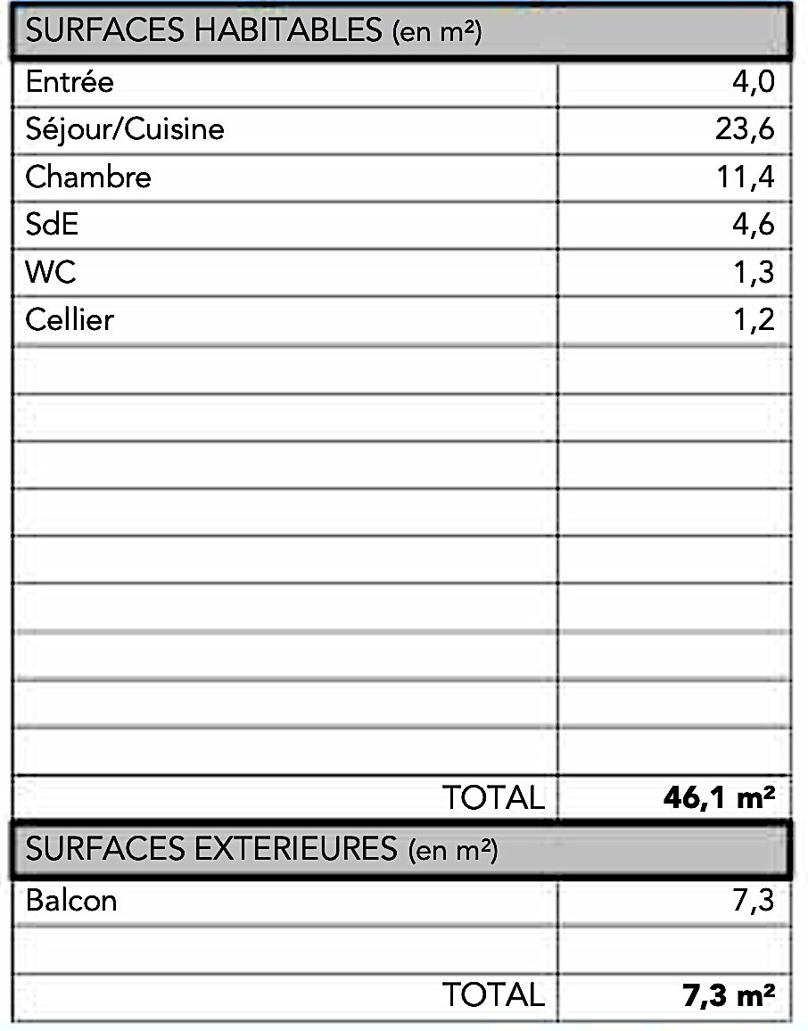 Beau T2 au 3è étage expo sud/ouest + nord/ouest de 46,1m2 :