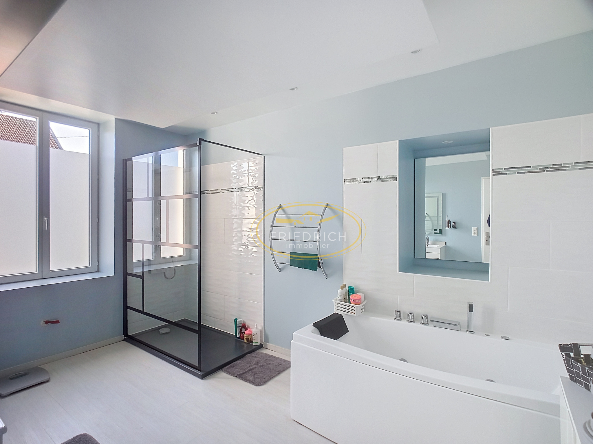 - Salle de bains (11m2) sol aprquet flottant, double vasques sur meuble bas, miroirs lumineux, baignoire, douche à l'italienne, convecteur électrique, VMC, fenêtre ;