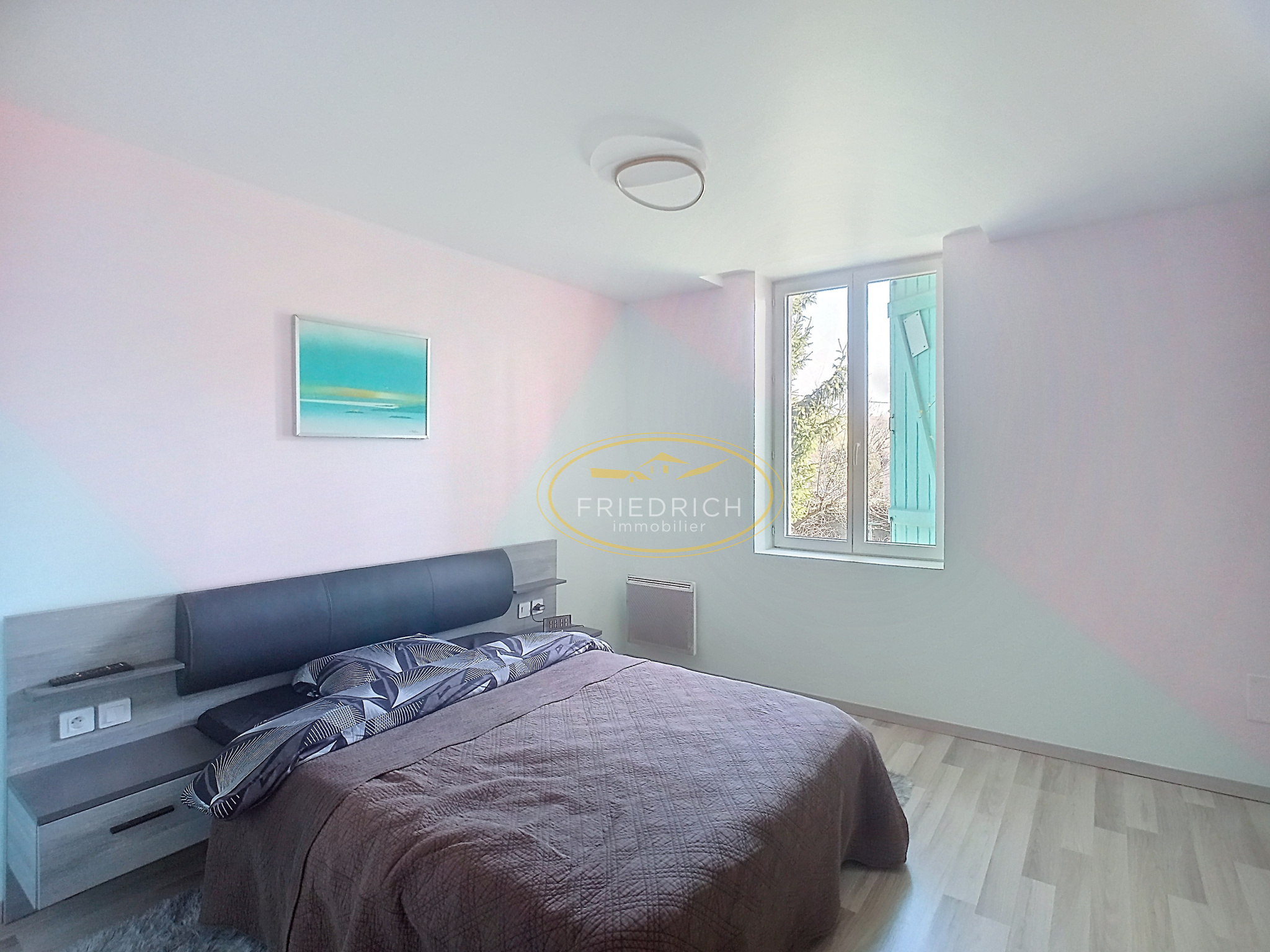 - Chambre 1 (15,4m2) avec dressing attenant : sol parquet flottant, convecteur électrique, 2 fenêtres ;