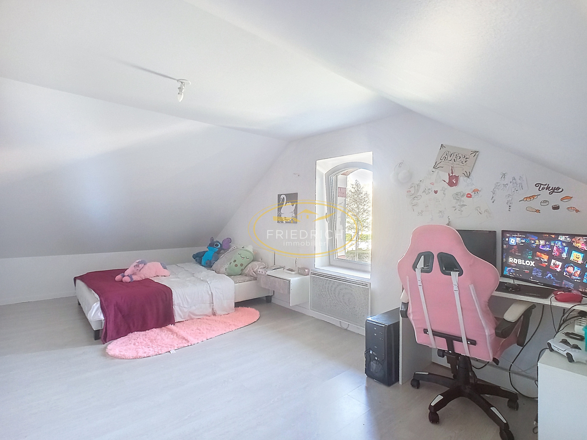 - Palier (2m2) et salle de jeux (16,8m2) : sol revêtement plastique ;