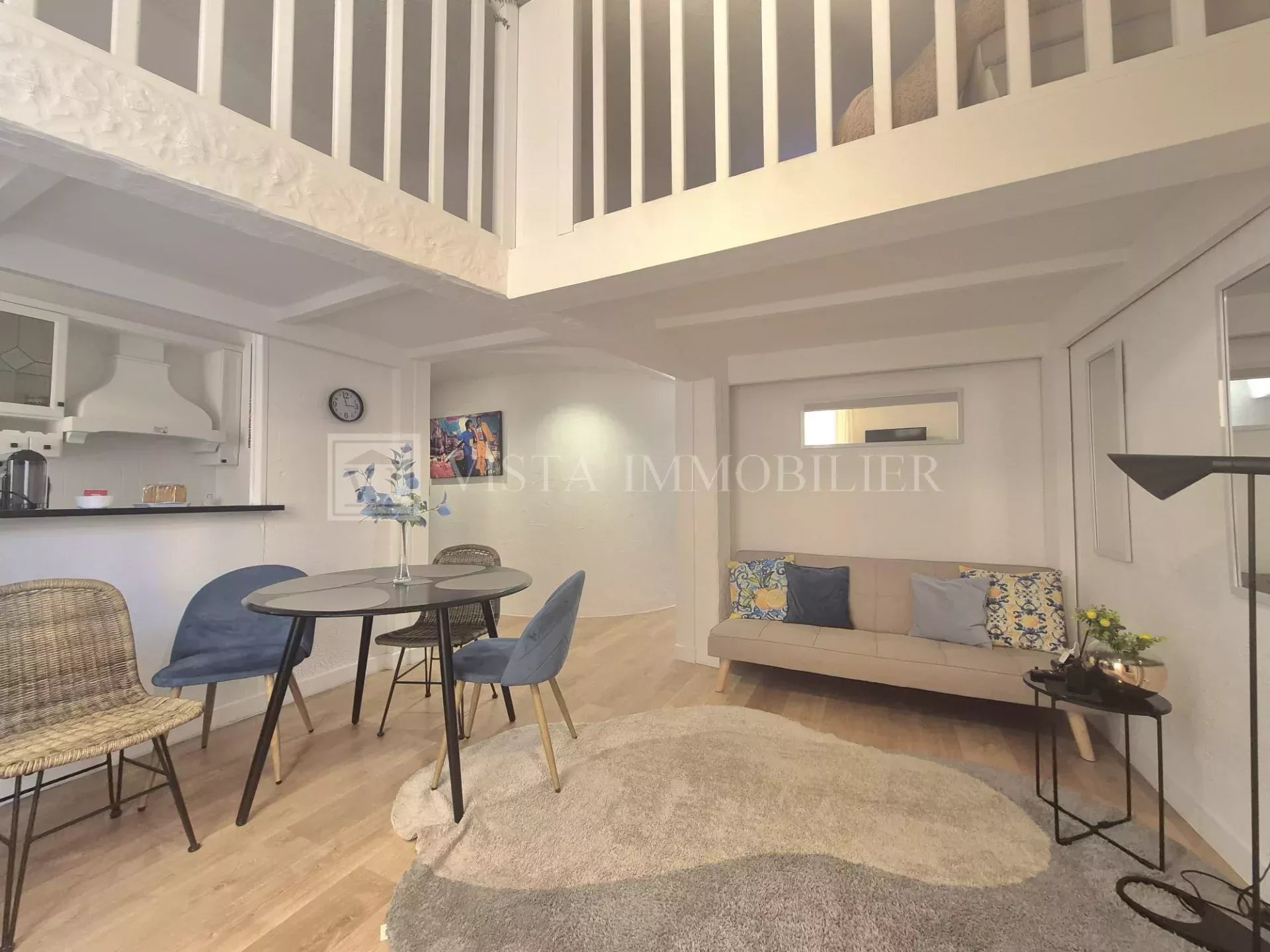 Le salon bénéficie également d’une mezzanine aménagée au-dessus, apportant un espace supplémentaire pouvant être utilisé comme coin nuit pour recevoir des invités, bureau ou espace de rangement selon les besoins. Cette configuration apporte du charme et permet d’optimiser les volumes de l’appartement.