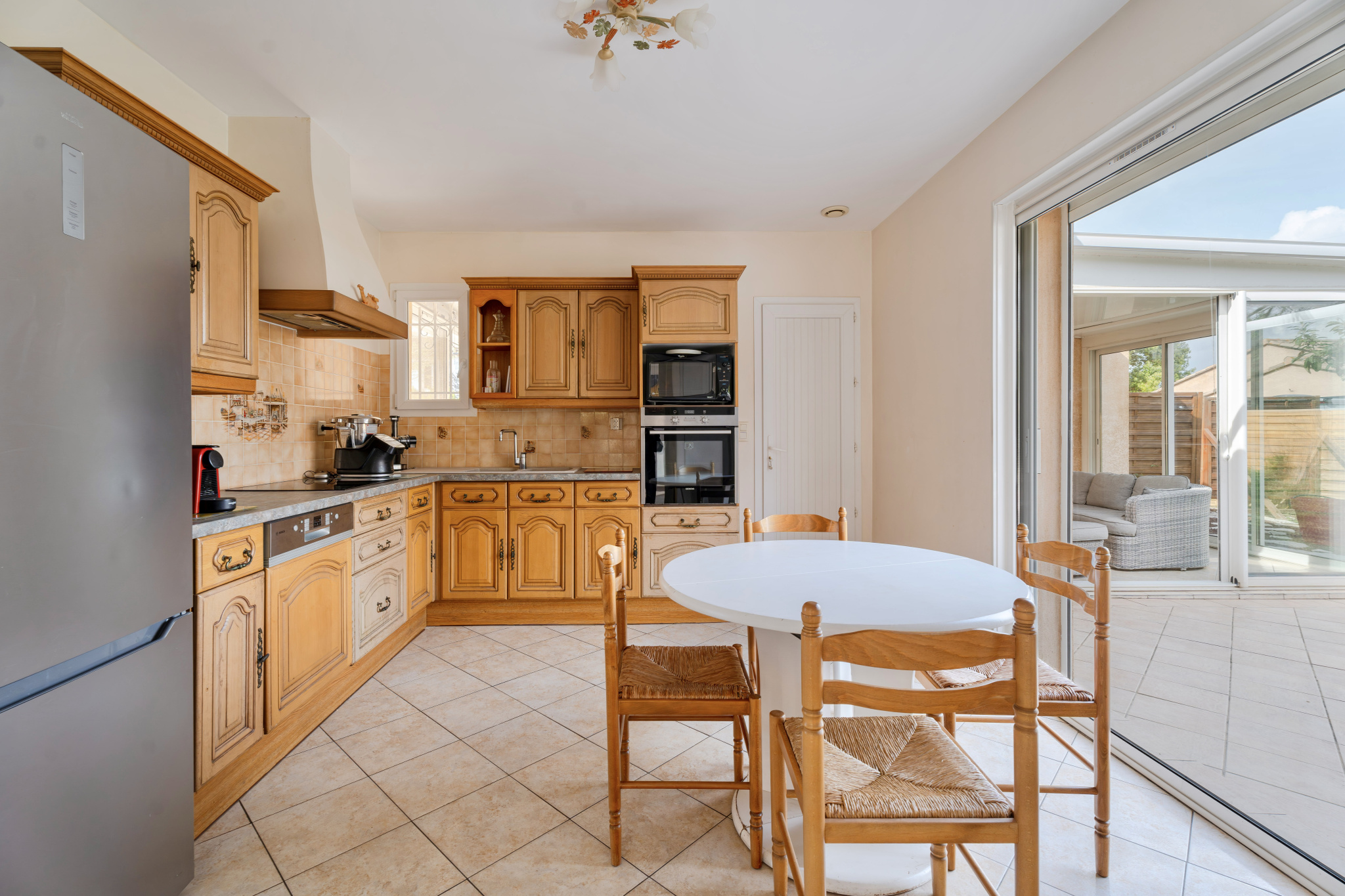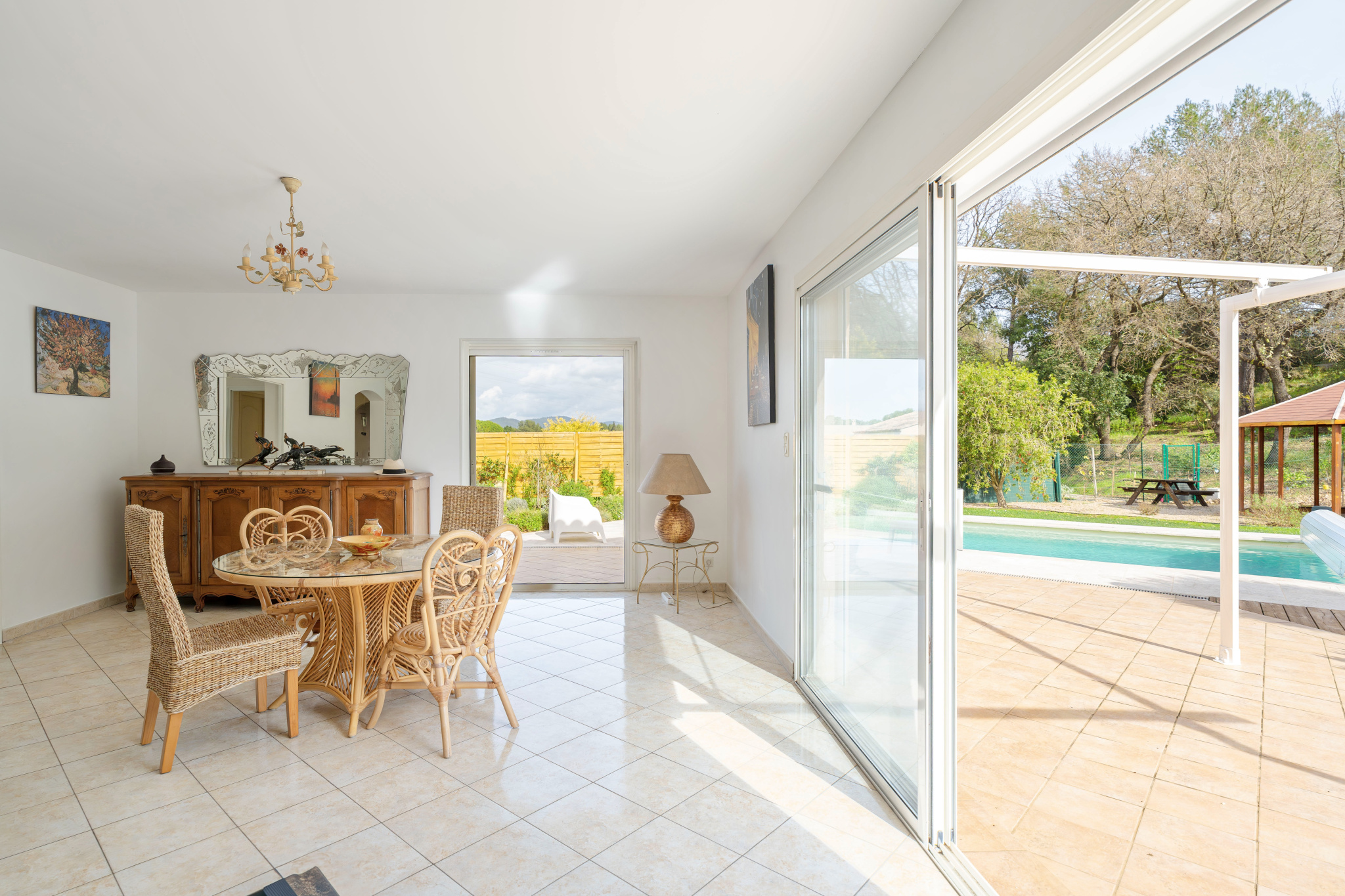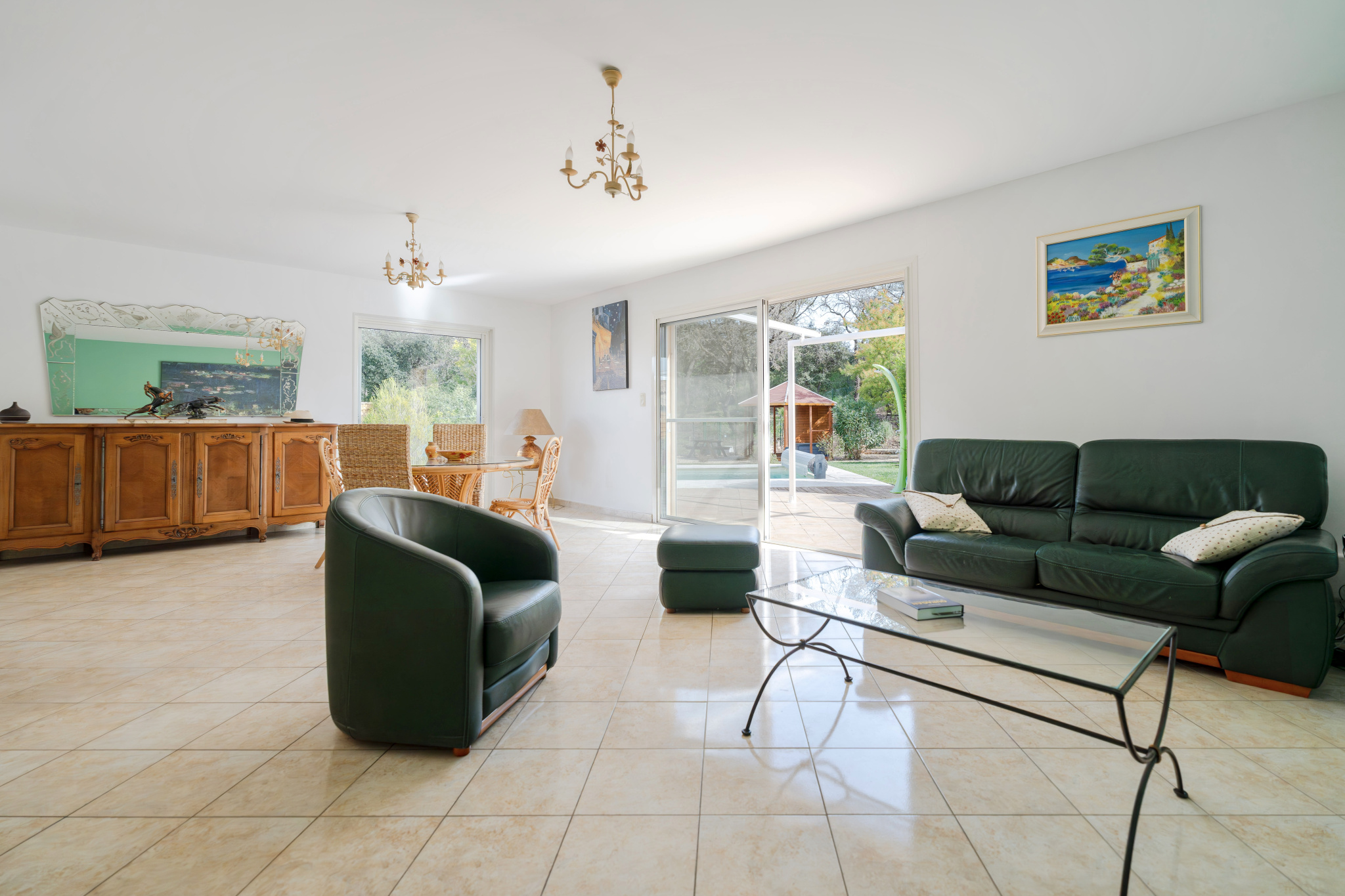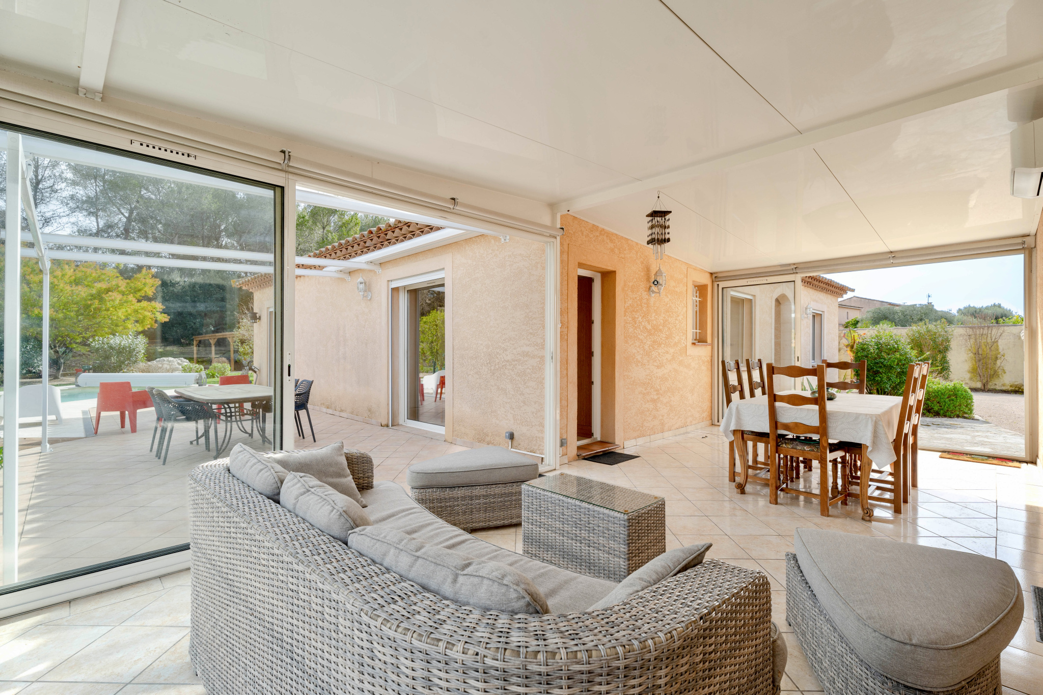 Un vaste séjour, baigné de lumière, ouvert sur la terrasse et la piscine exposées plein sud