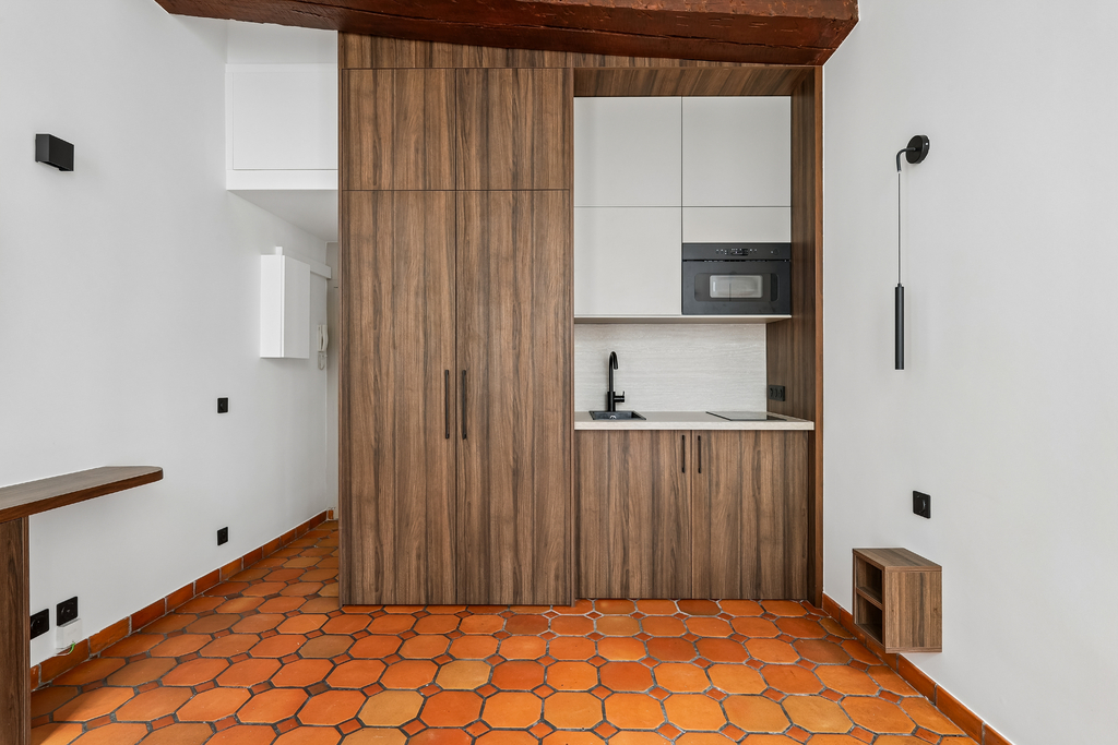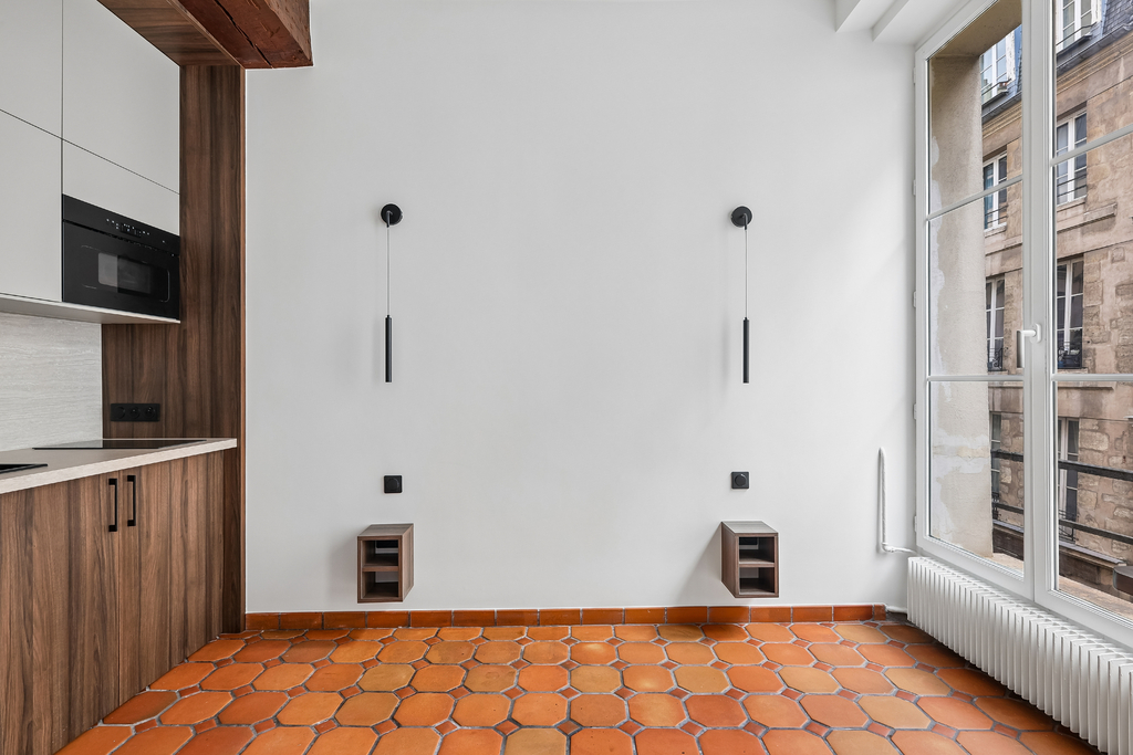 Le charme de l'ancien s'exprime pleinement à travers une grande hauteur sous plafond de 3m20, de belles poutres d'époque et des tomettes, conférant à l'ensemble une atmosphère chaleureuse et authentiquement parisienne.