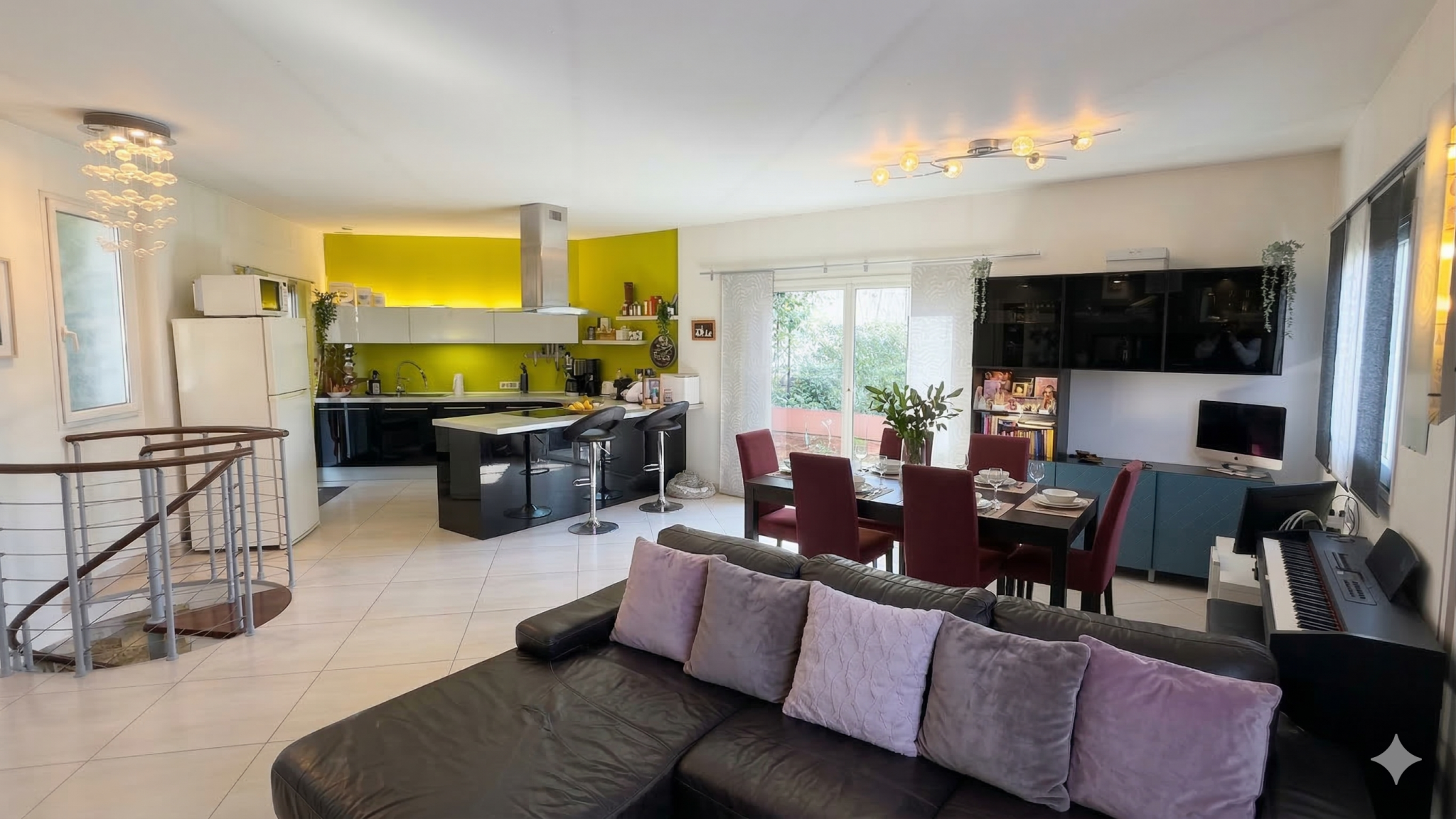 La pièce de vie de près de 44 m2 avec cuisine ouverte bénéficie d'une climatisation réversible par pompe à chaleur, ainsi que d'équipements de sécurité incluant un système de caméras et un portail électrique.