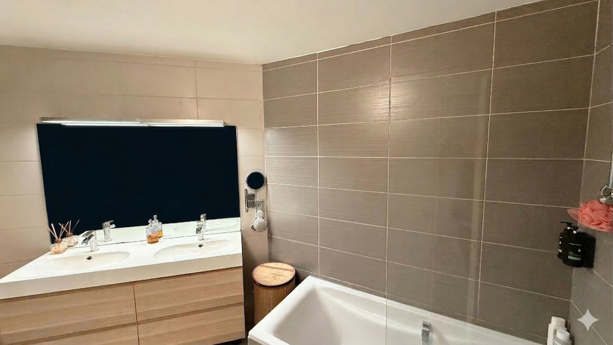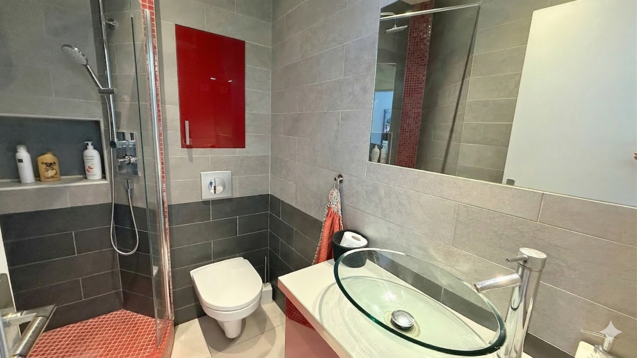 Le rez-de-chaussée dispose d'une première salle d'eau avec WC, tandis que l'étage inférieur accueille une salle de bains complète et un second WC indépendant.