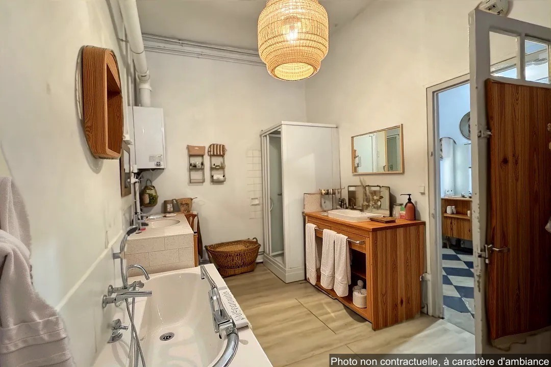 Belle hauteur sous plafond, des matériaux anciens authentiques de qualité, tomettes, parquet massif chêne, baton rompu, moulures.