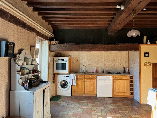 sur la gauche, l'accès à l'étage et une cuisine avec salle à manger, prolongée par une buanderie,