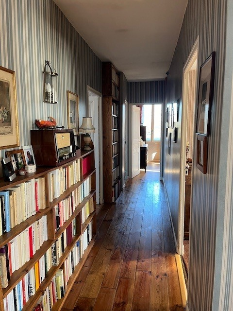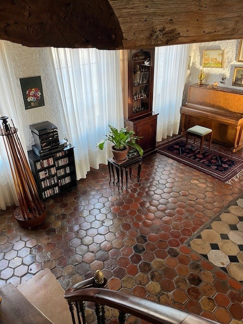 sur la droite, un séjour double avec cheminée, bénéficiant de matériaux anciens : tommettes, pierre apparente, plafonds à la française,