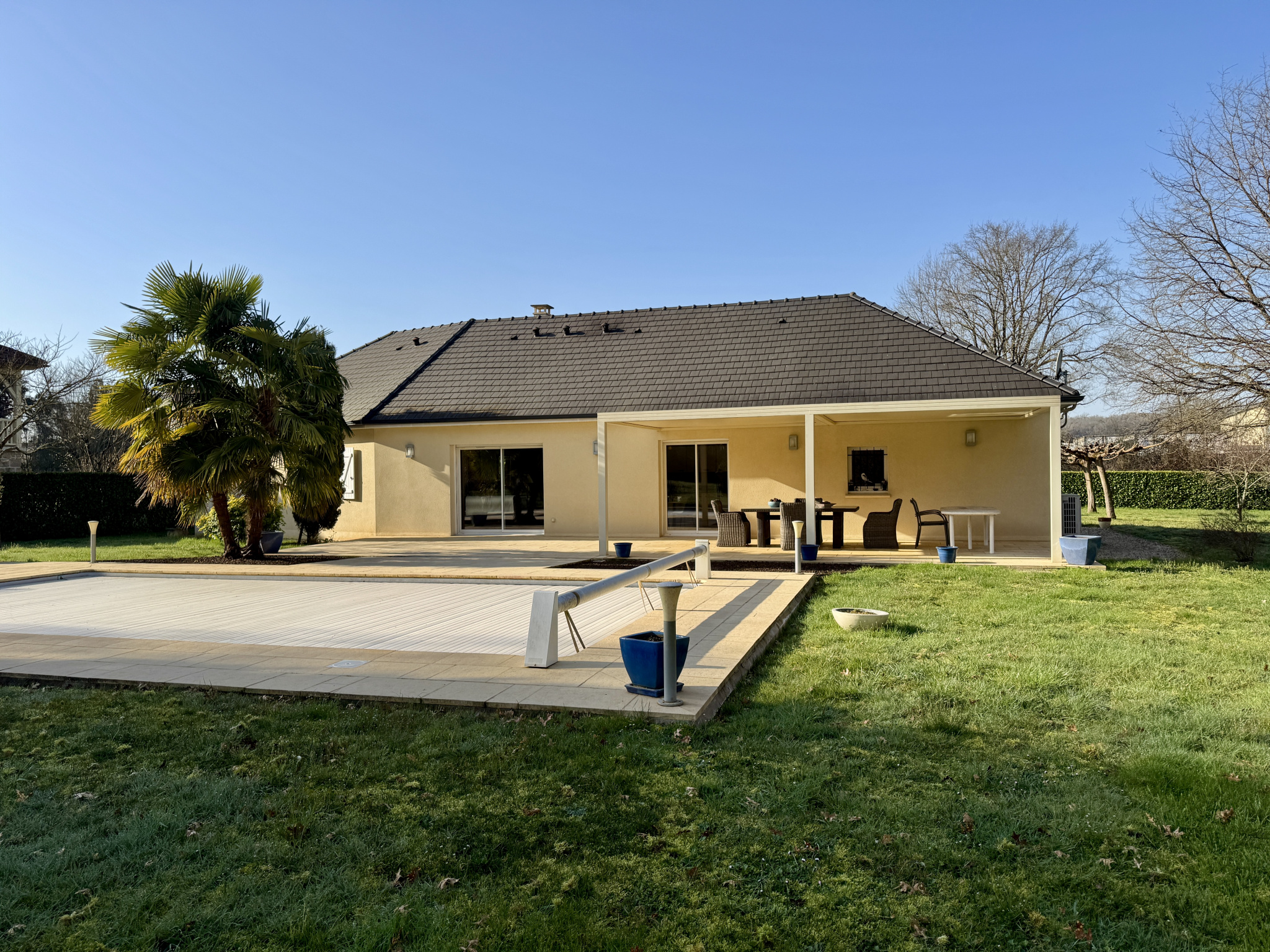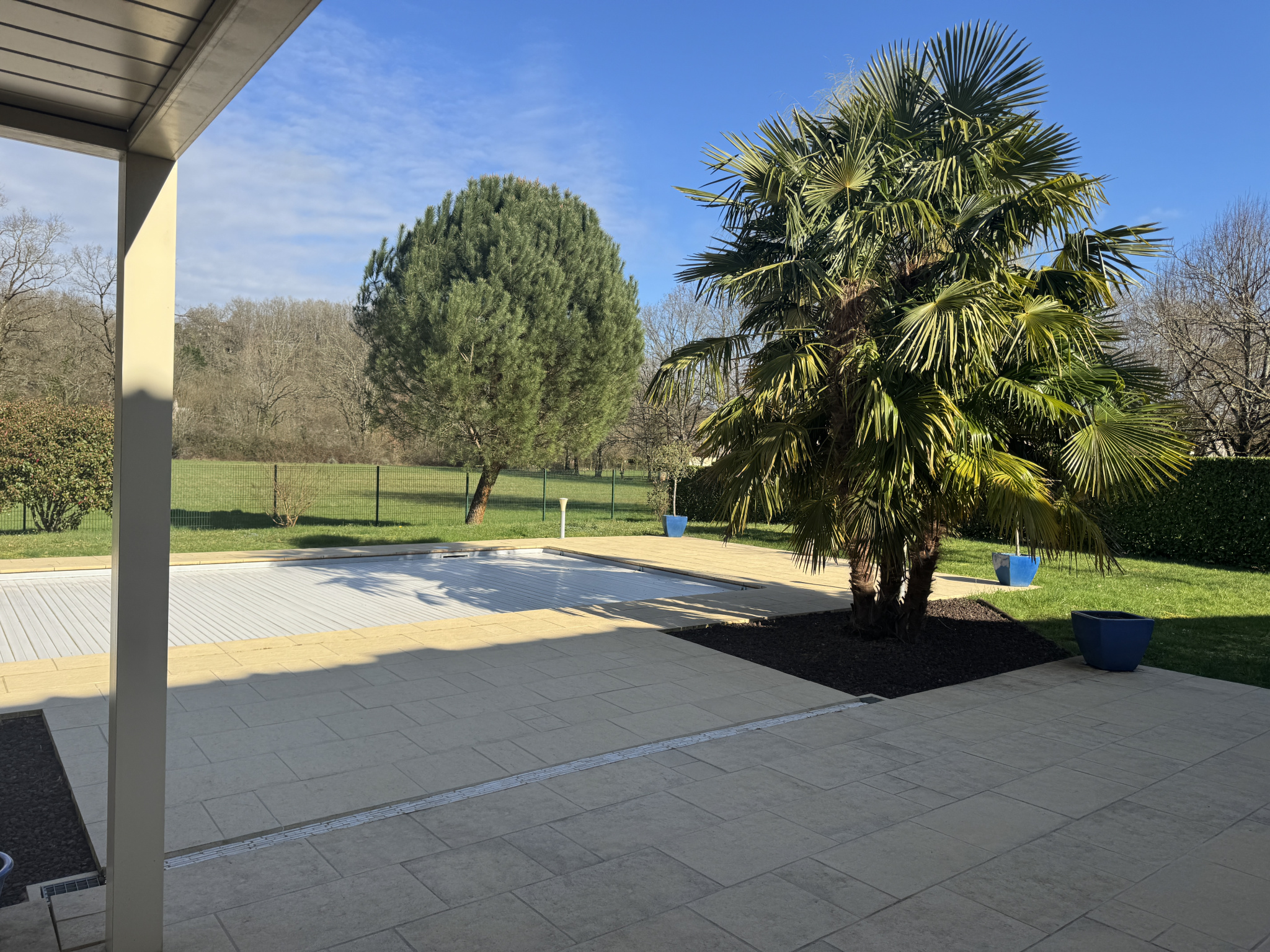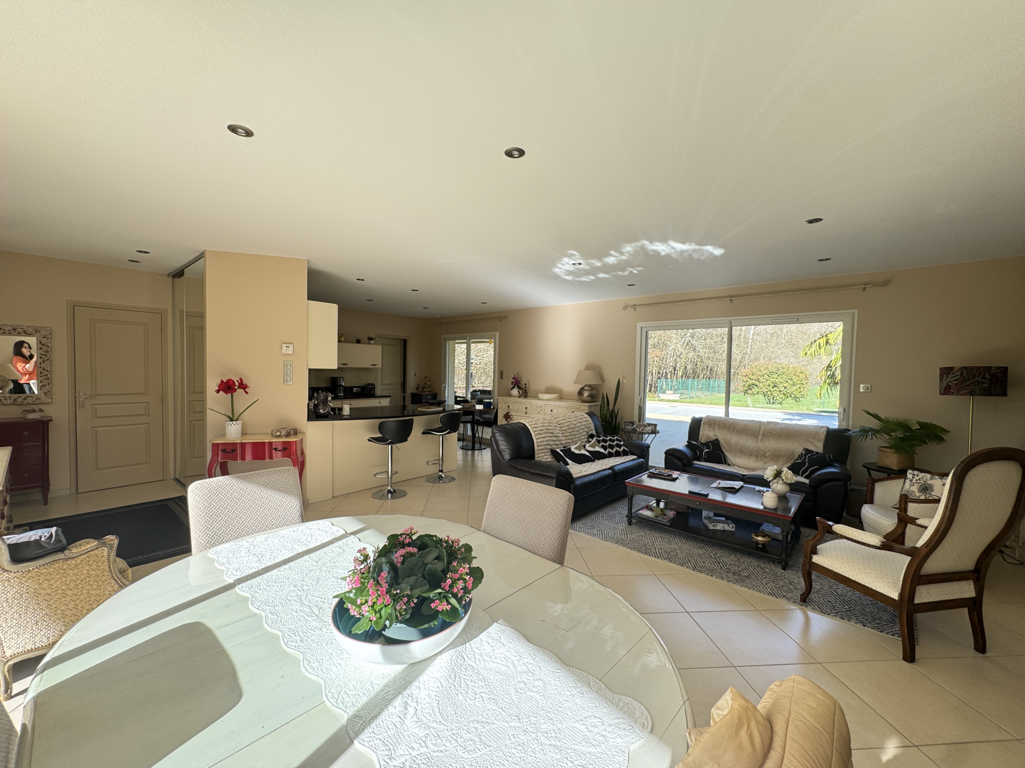 A proximité immédiate des commerces et de l'école élémentaire, cette maison construite en 2009 offre 110m2 habitables de plain pied. Luminosité et prestations en sont les atouts majeurs. Vous pourrez profiter d'une très belle pièce de vie ouverte d'environ 50m2 avec une cuisine entièrement équipée. Trois chambres, salle d'eau, deux WC et cellier. Garage attenant dans lequel vous pourrez abriter deux voitures. Le parc, parfaitement entretenu, vous permettra de profiter d'une belle terrasse avec accès direct sur la piscine et d'une partie arborée. Propriété entièrement cloturée.
