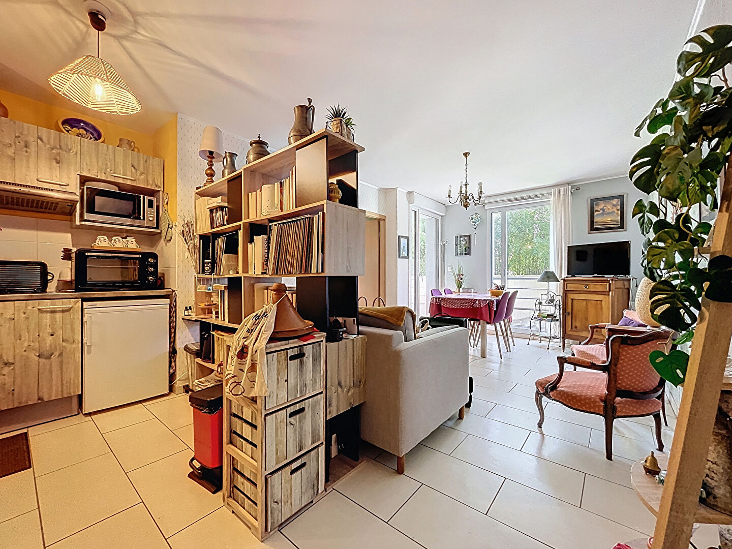 L'appartement se compose d'une belle pièce de vie avec cuisine aménagée et équipée ouverte, offrant un espace convivial et fonctionnel. Le séjour donne accès à une agréable terrasse, également accessible depuis la chambre, permettant de profiter pleinement du calme et du cadre arboré de la résidence.