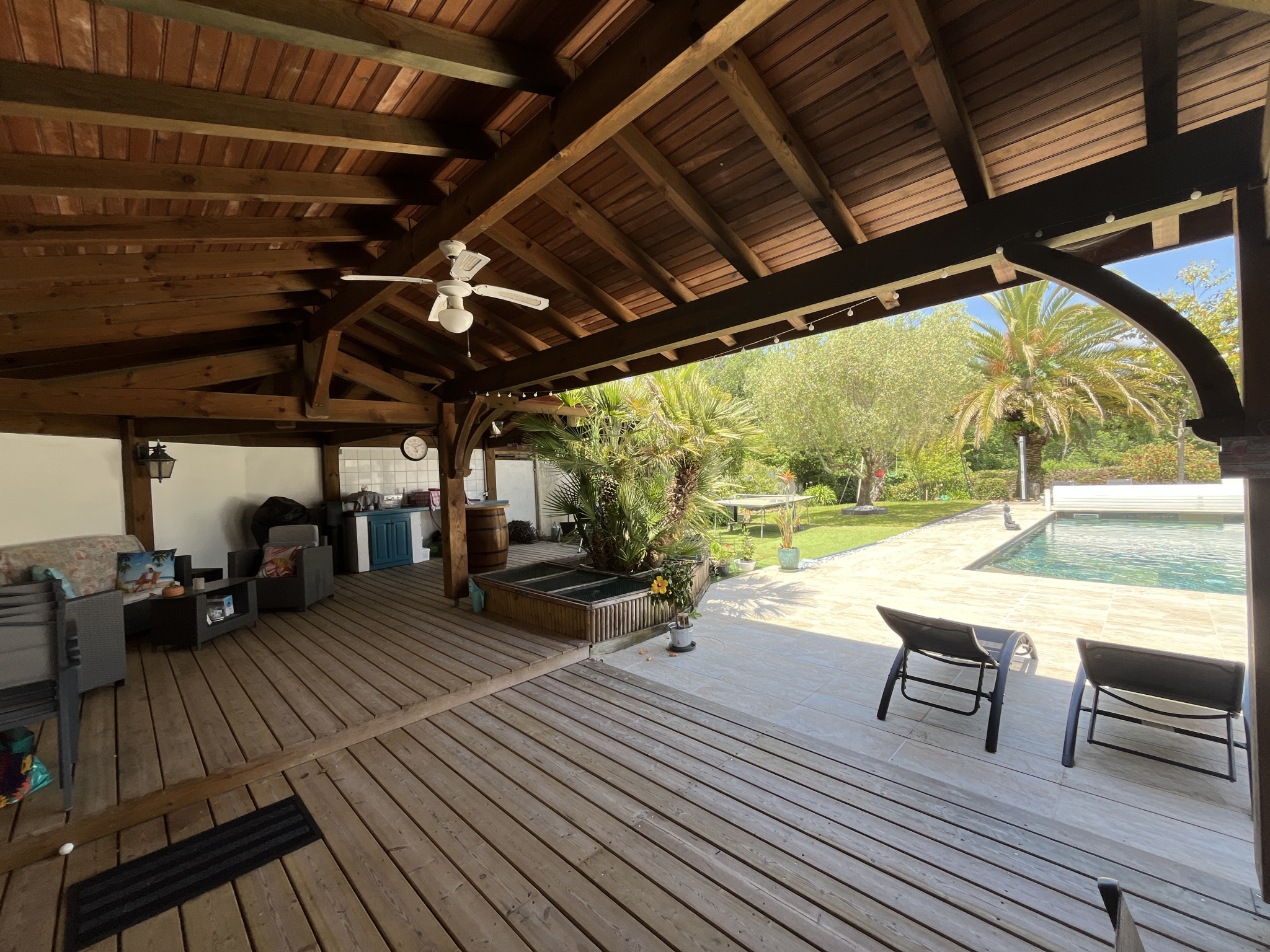 Les extérieurs sont tout aussi séduisants et offrent differents espaces de détente : plus de 200 m2 de terrasses autour de la piscine , terrain de pétanque, parfait pour les moments de convivialité. Garage, abri voitures, atelier, vaste parking