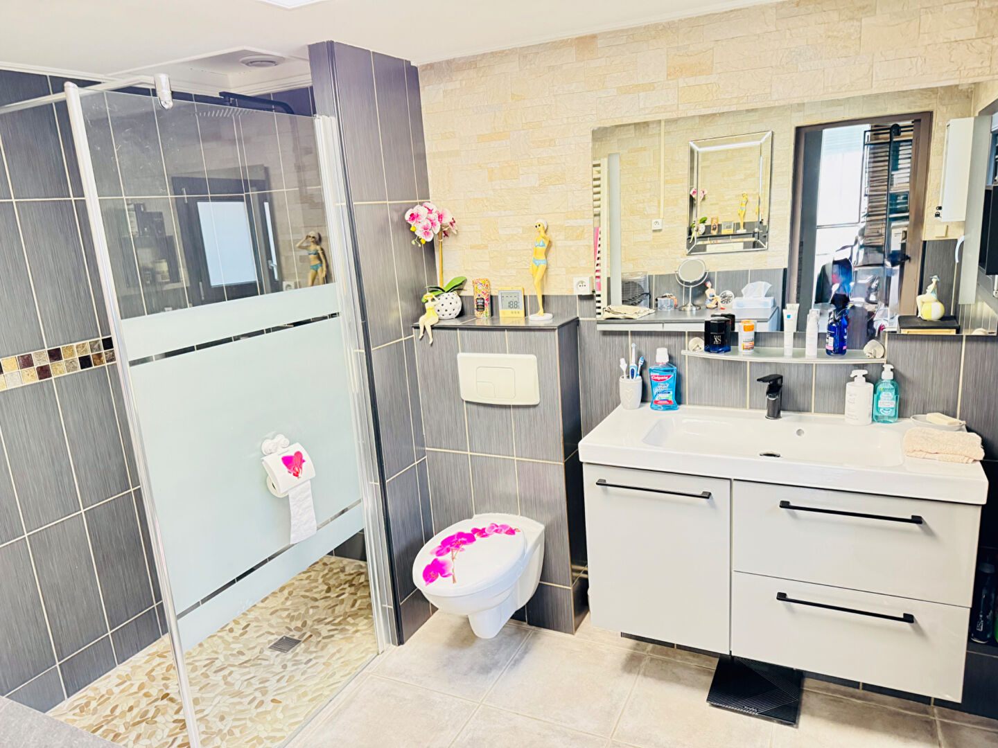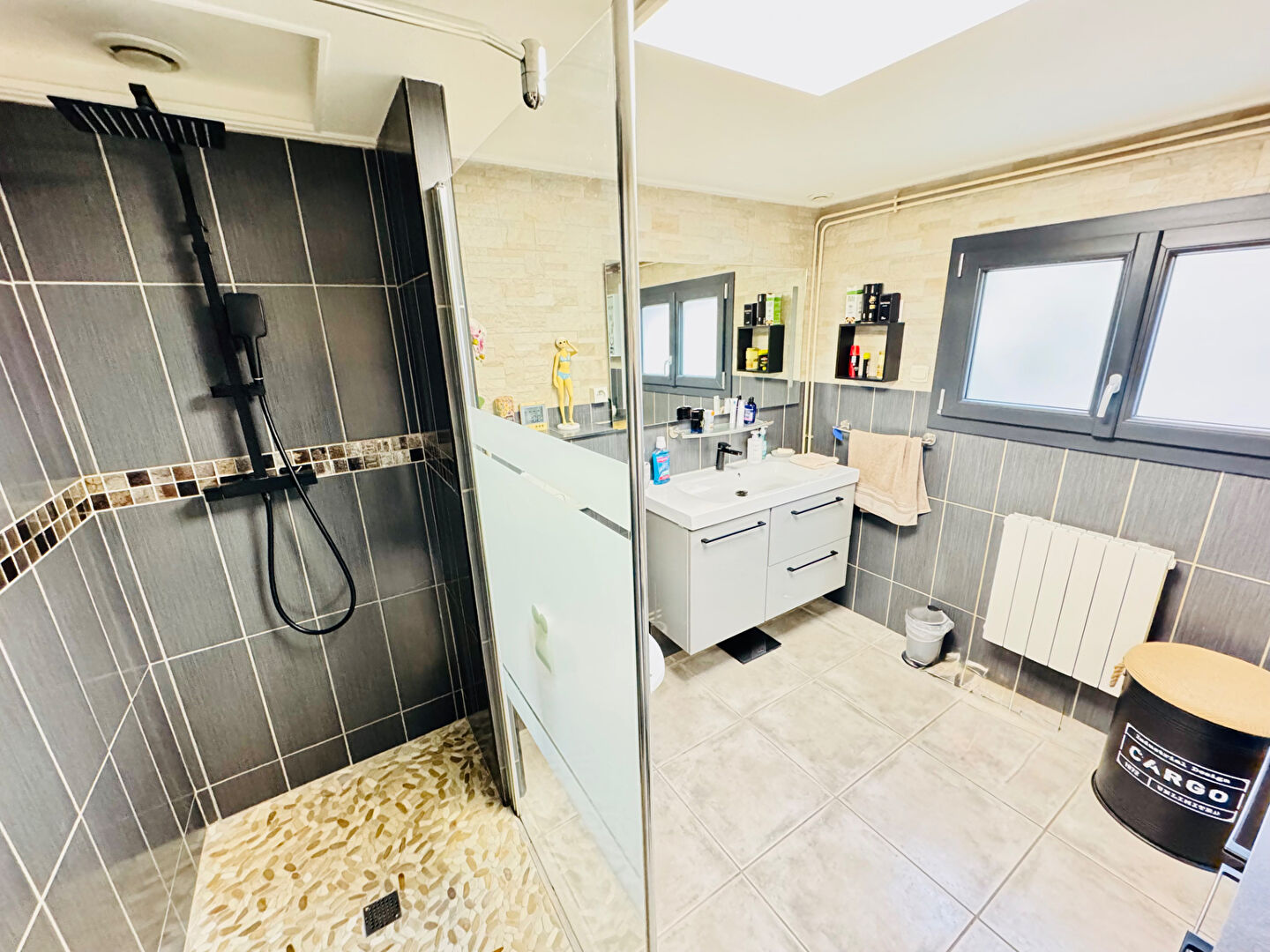 En extérieur, vous disposez d'un magnifique jardin avec terrasse entièrement clos et sans vis à vis.