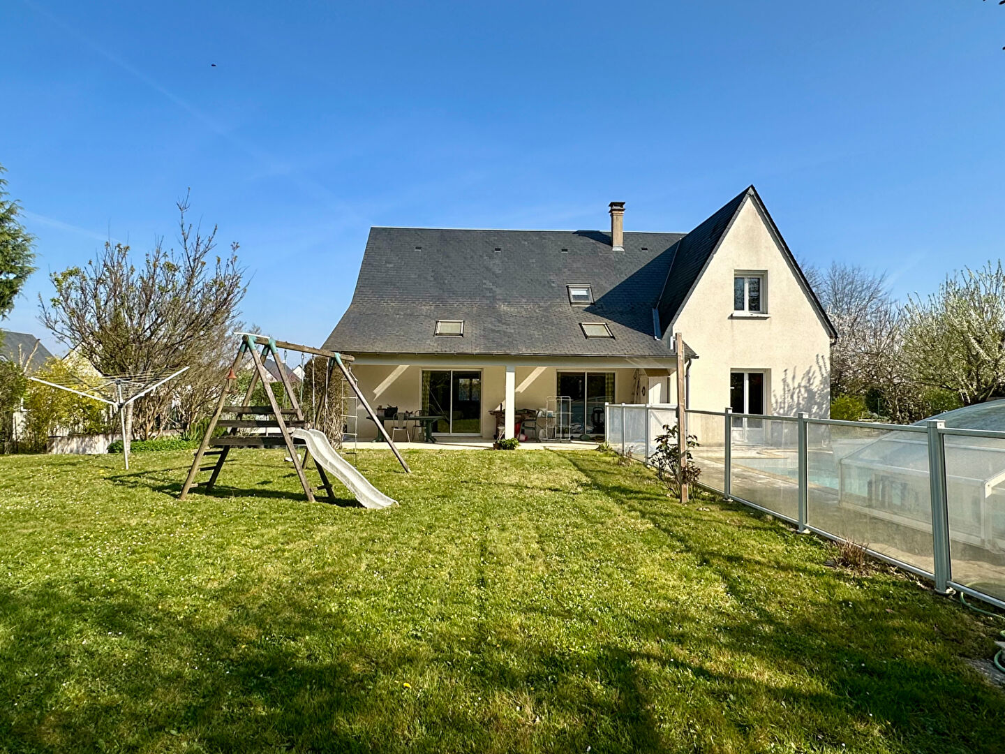 À l'extérieur, vous profiterez d'un jardin plein sud, sans vis-à-vis, agrémenté d'une piscine de 10 x 5 m. Une grande terrasse, en partie couverte, prolonge agréablement les espaces de vie.
