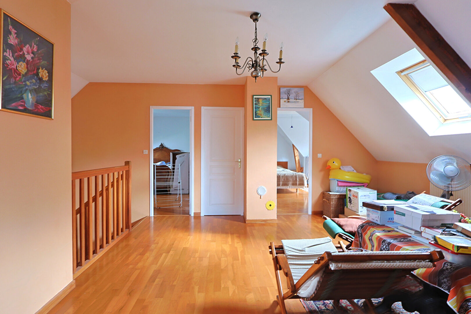 À l'étage, un grand palier mezzanine dessert quatre chambres supplémentaires de belle taille, une salle de bains et un WC indépendant.