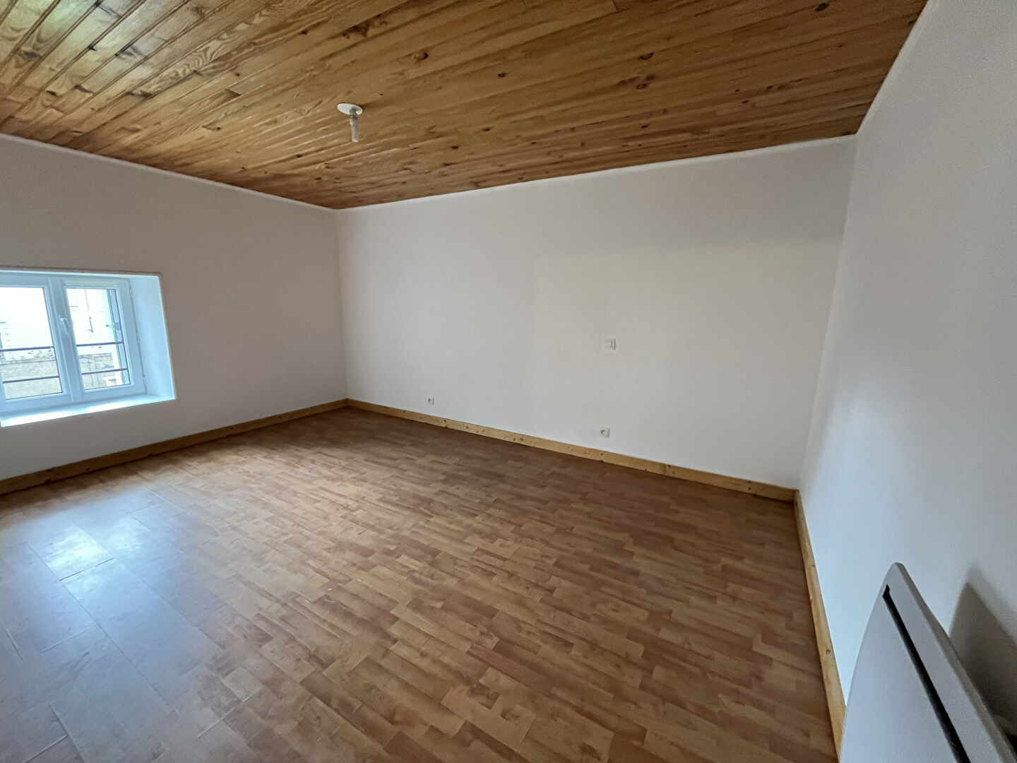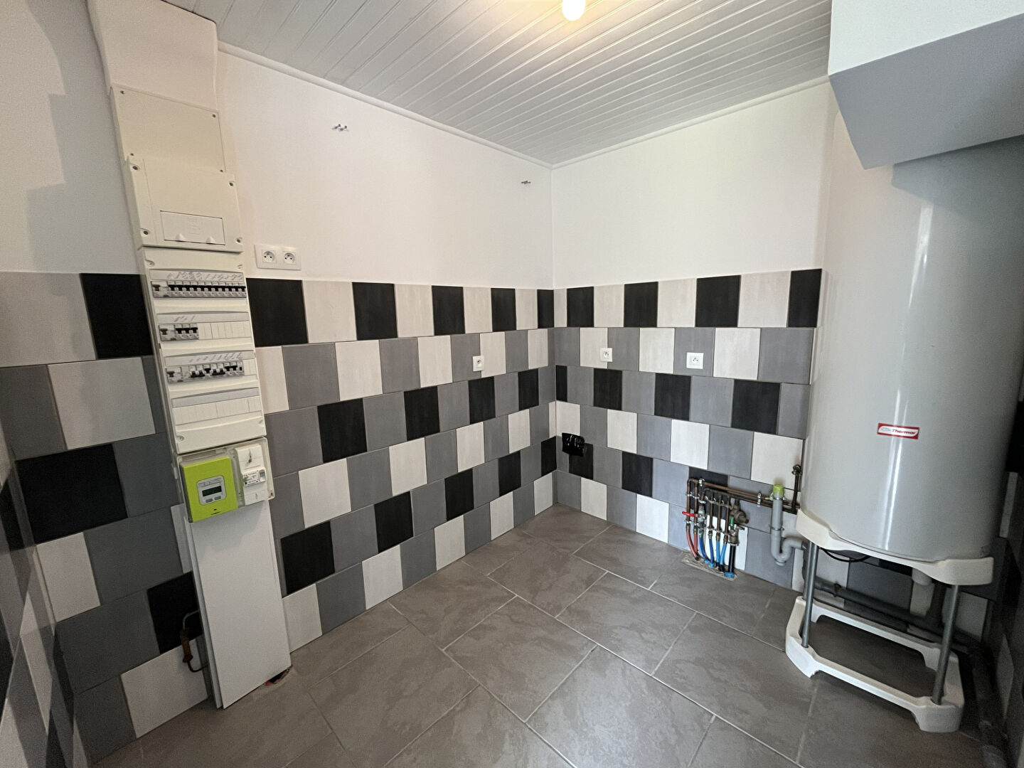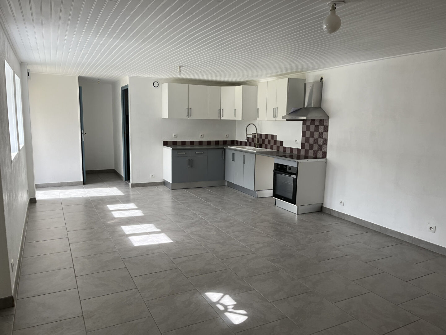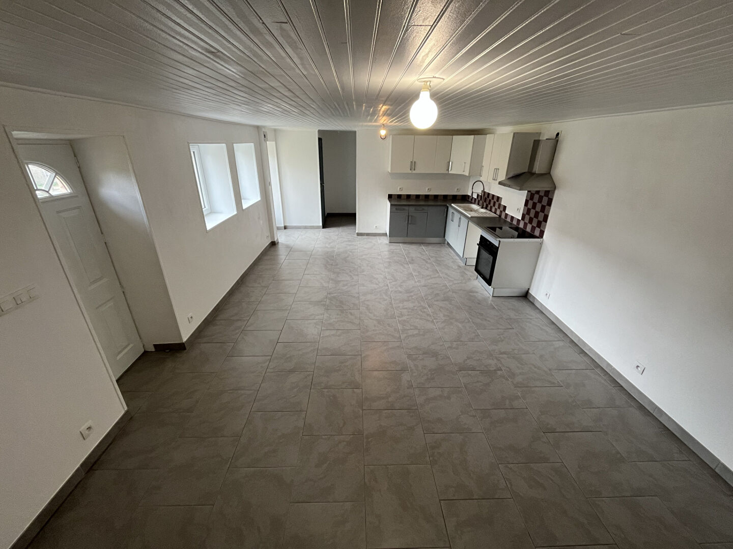 Belle pièce de vie de 34m² environ avec cuisine aménagée et poêle à granulés, buanderie -cellier .