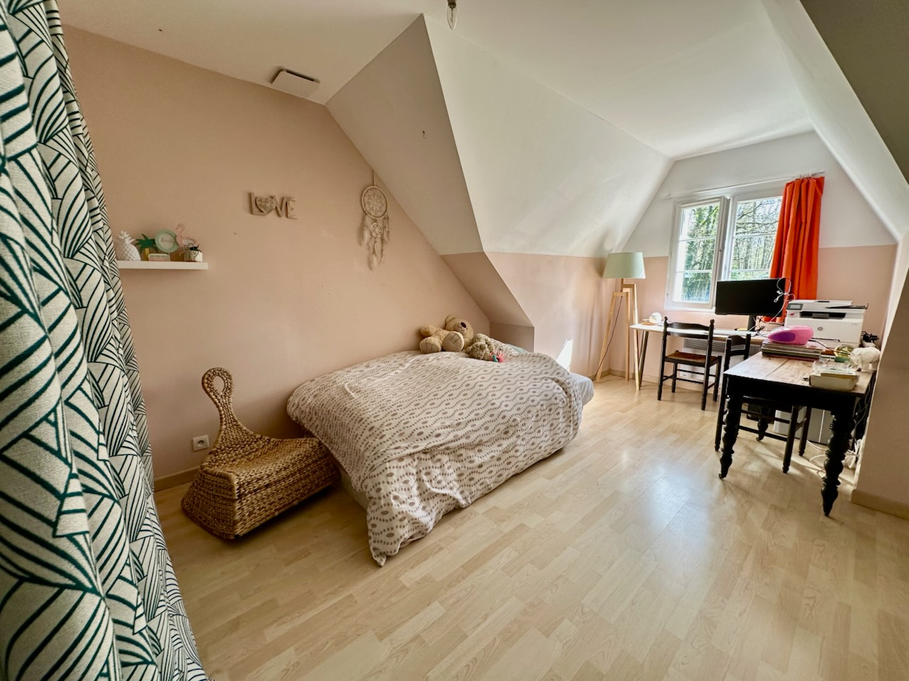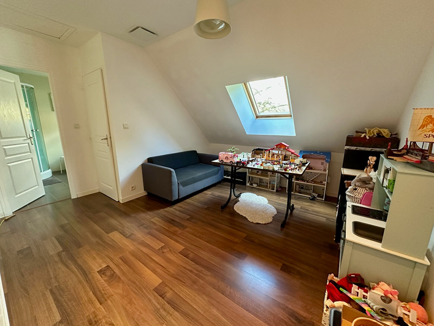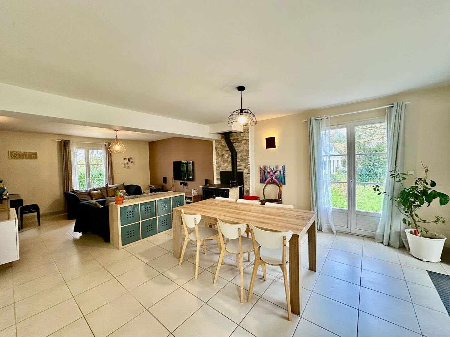 Belle pièce de vie lumineuse avec cuisine ouverte équipée et aménagée, poêle à bois, buanderie, toilettes, suite parentale au rez-de-chaussée, avec sa salle d'eau et dressing.